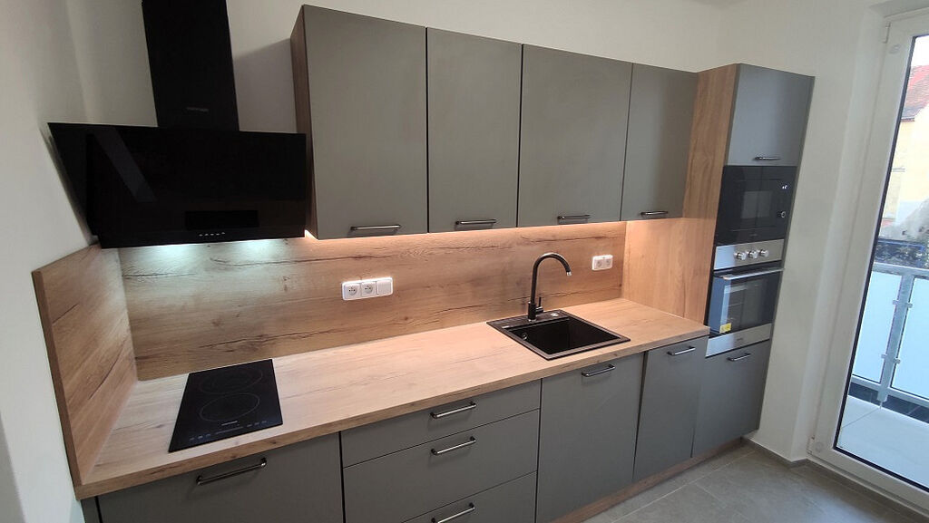 Interiér bytu působí vzdušně a čistě. Kuchyňská linka je vybavena vestavěnou mikrovlnnou i klasickou troubou, varnou deskou s digestoří a myčkou na nádobí. Balkon, kuchyně a jeden z pokojů jsou orientovány na východ, takže ranní slunce příjemně prosvětluje obytný prostor. Druhý pokoj s výhledem na Kulturní dům je situován na západ a nabízí klidné odpolední světlo. Tato kombinace zajišťuje rychlé a efektivní větrání a příjemnou tepelnou pohodu po celý den.