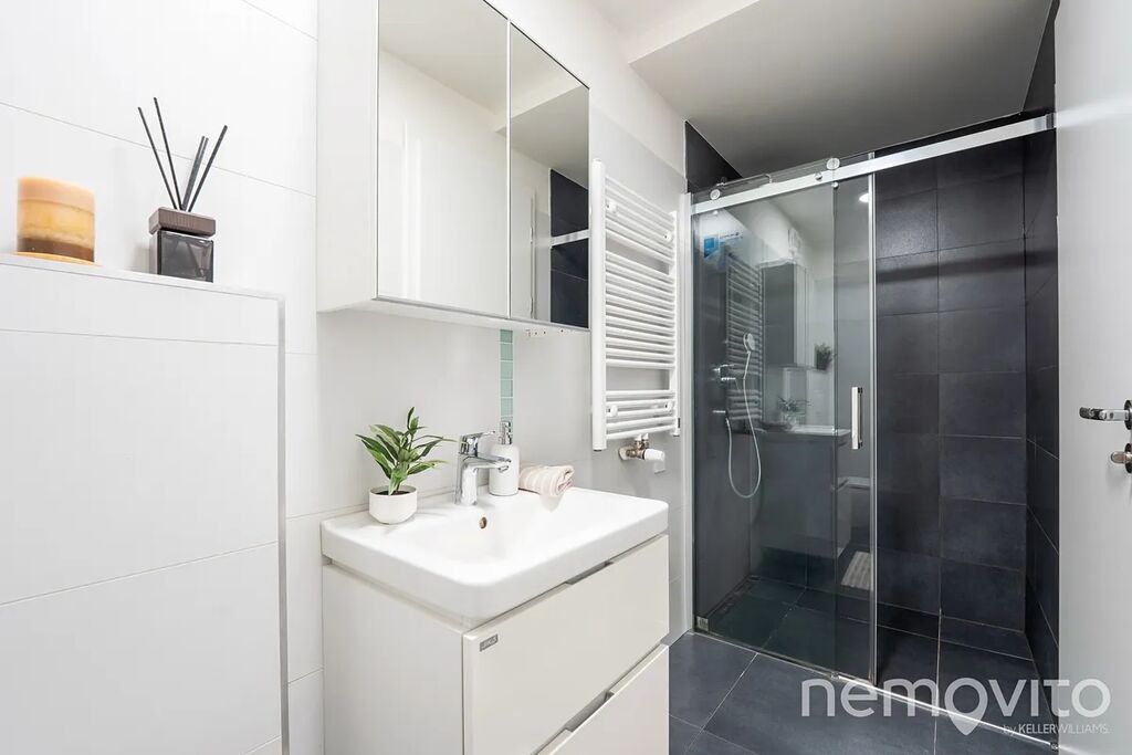 Hlavní obytný prostor s velkými okny do zahrady má rovných 40 m2 a pojí v sobě velkou kuchyni, obývák a prostor na plnohodnotnou jídelnu. Pod příjemnou dřevěnou podlahou je podlahové topení, přičemž roční spotřeba se pohybuje do úrovně 14 MWh plynu. Skvělým bonusem je samostatná prádelna/technická místnost, která má vstup z obýváku i ze zahrady a její velikost je 7 m2. Prádelnu pak doplňují ještě dvě komory - jedna nahoře a jedna dole.