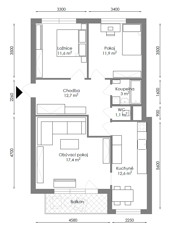 Byt disponuje vstupní chodbou se skříní, samostatným WC, koupelnou s vanou, kuchyňskou linkou se spotřebiči, obývacím pokojem, ložnicí a dětským pokojem. Z obývacího pokoje je přímý vstup na balkon. Balkon prošel kompletní rekonstrukcí, nové prosklené tabule + UV zastínění pomocí rolet. Balkon je orientovaný do zeleně a nabízí tak nejen krásné výhledy, ale i klid. K bytu náleží také sklep 2 m².
