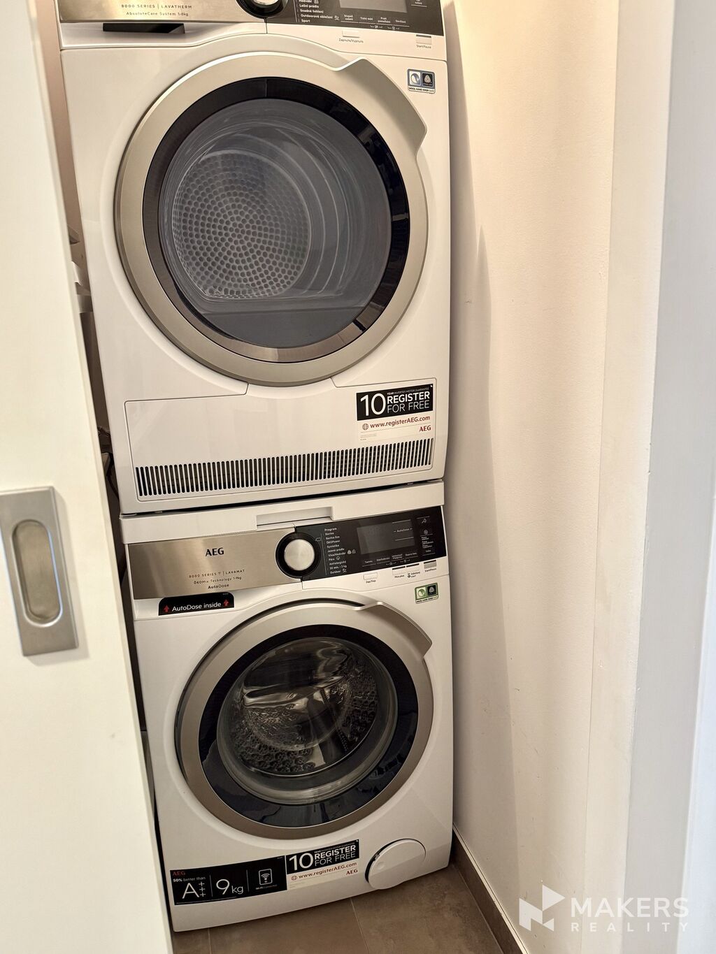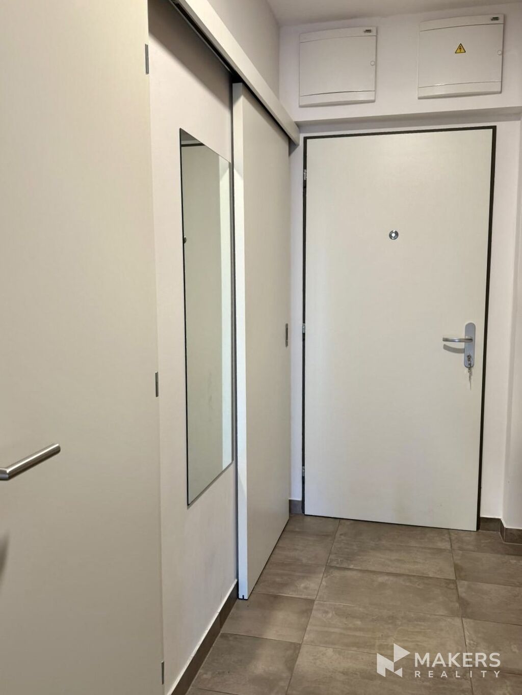Dispozice bytu zahrnuje vstupní předsíň s otevřeným úložným systémem o délce cca 3 metry, obývací pokoj s kuchyňským koutem, ložnici, koupelnu s toaletou a komoru. Kuchyňská linka je kompletně vybavena spotřebiči – elektrickou troubou, sklokeramickou varnou deskou, mikrovlnnou troubou, myčkou, lednicí s mrazákem i digestoří. V koupelně je sprchový kout, umyvadlo se skříňkou, topný žebřík, skříň a toaleta. V bytě ny