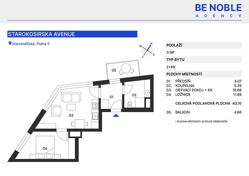 Exkluzivně nabízíme světlý a prostorný byt 2+kk o celkové ploše 43 m² s balkonem (5 m²) a sklepem (2 m²), který se nachází ve 3. patře moderní novostavby z roku 2025 v rezidenčním projektu Starokošírská Avenue v oblíbené městské části Praha 5 – Košíře.
