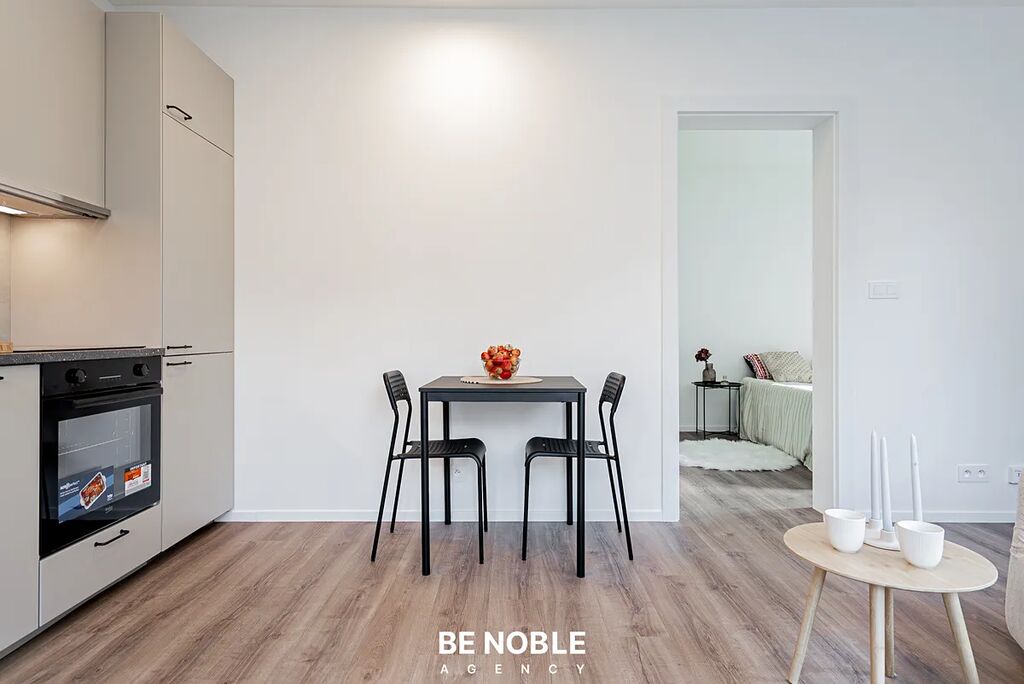 Hlavní obytný prostor nabízí velká okna, která zajišťují dostatek denního světla. Díky nevšední dispozici je možné umístit pohodlnou sedací soupravu, jídelní stůl i pracovní kout. Již vestavěná kuchyňská linka s elegantním designem je vybavena moderními spotřebiči a poskytuje dostatek úložného i pracovního prostoru.
