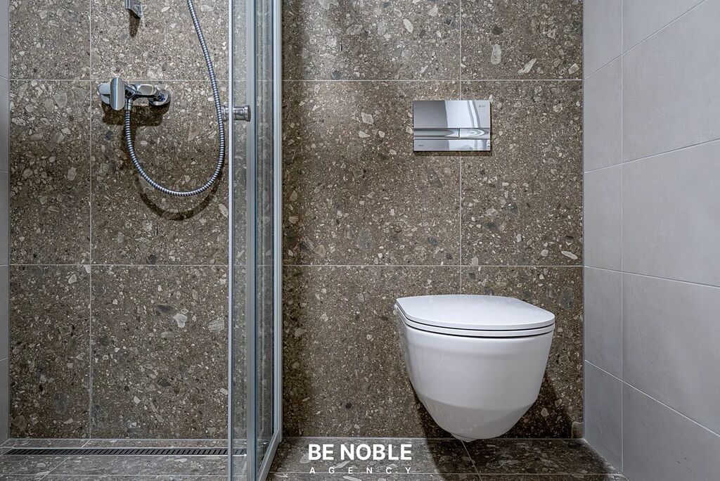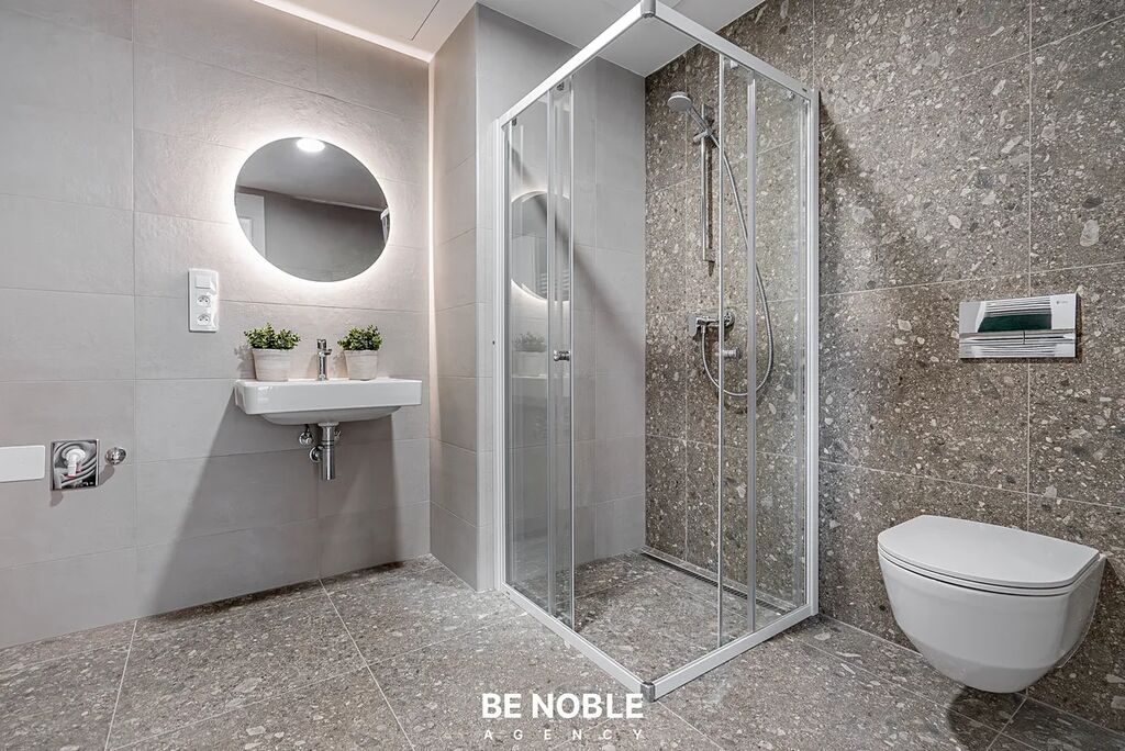 Stylová koupelna s rohovým sprchovým koutem, místem pro pračku se sušičkou a velkoformátovými obklady až ke stropu. Sanitární vybavení je od renomované značky Laufen.