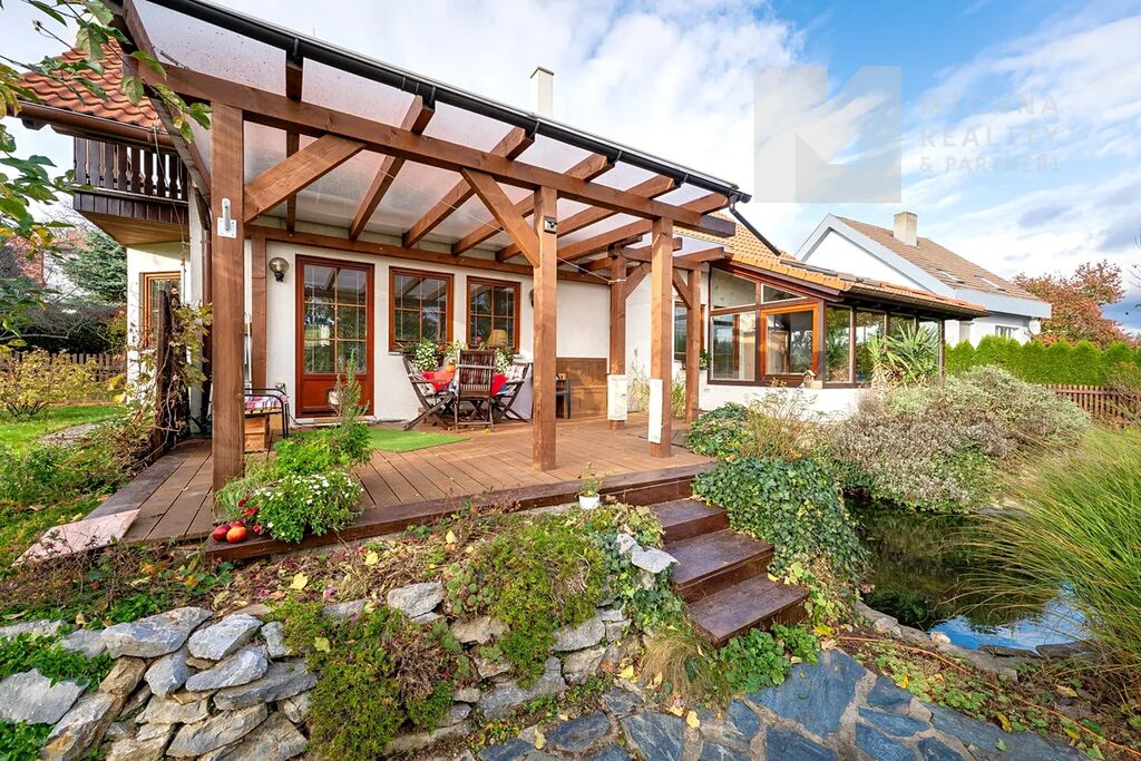 K domu náleží rozsáhlý pozemek o výměře 1 091 m² s upravenou zahradou, venkovním bazénem a okrasným jezírkem, které vytvářejí příjemné prostředí pro relaxaci.