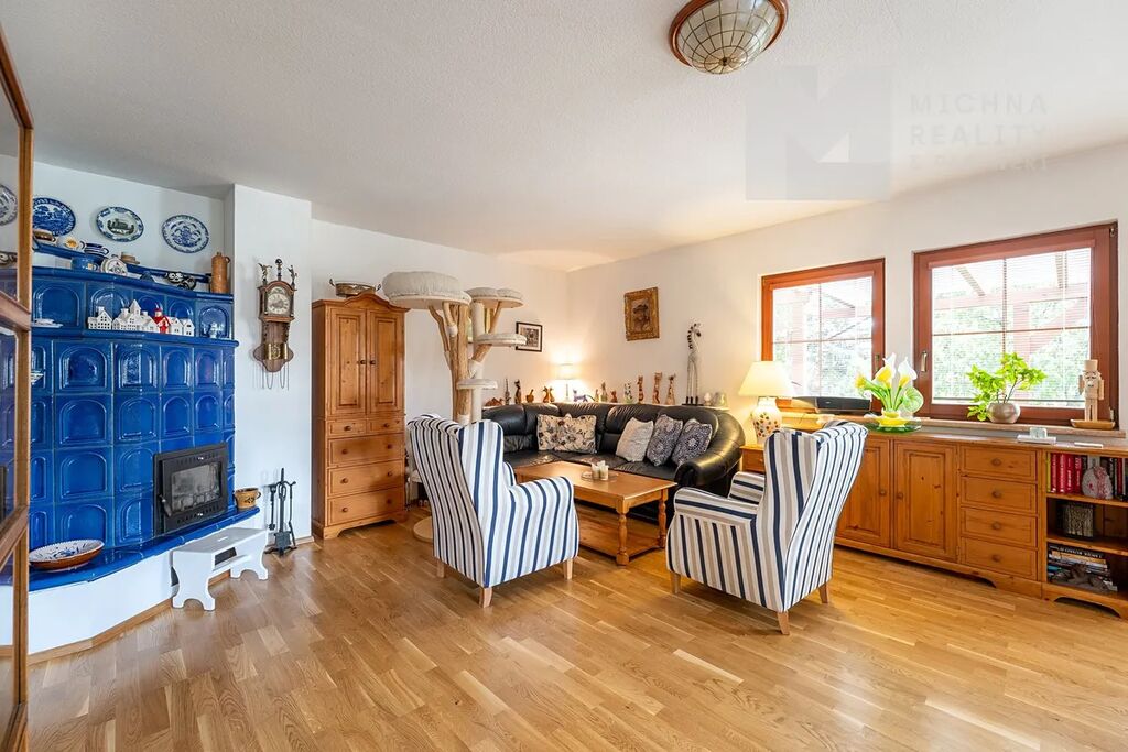 V obývacím pokoji jsou navíc kachlová kamna pro příjemnou atmosféru i úsporu nákladů.