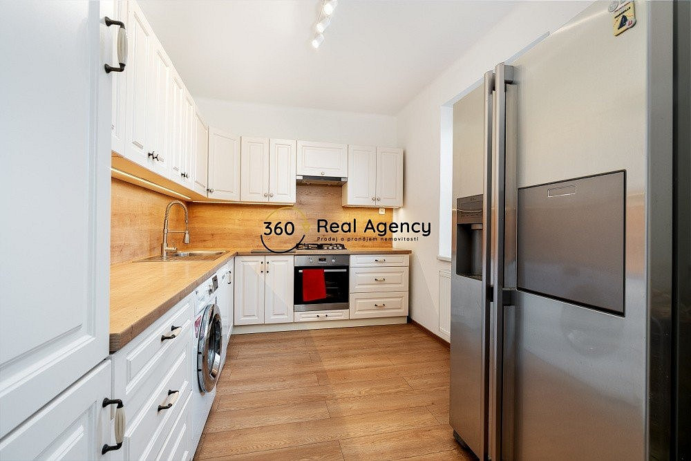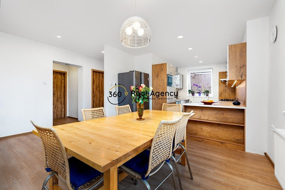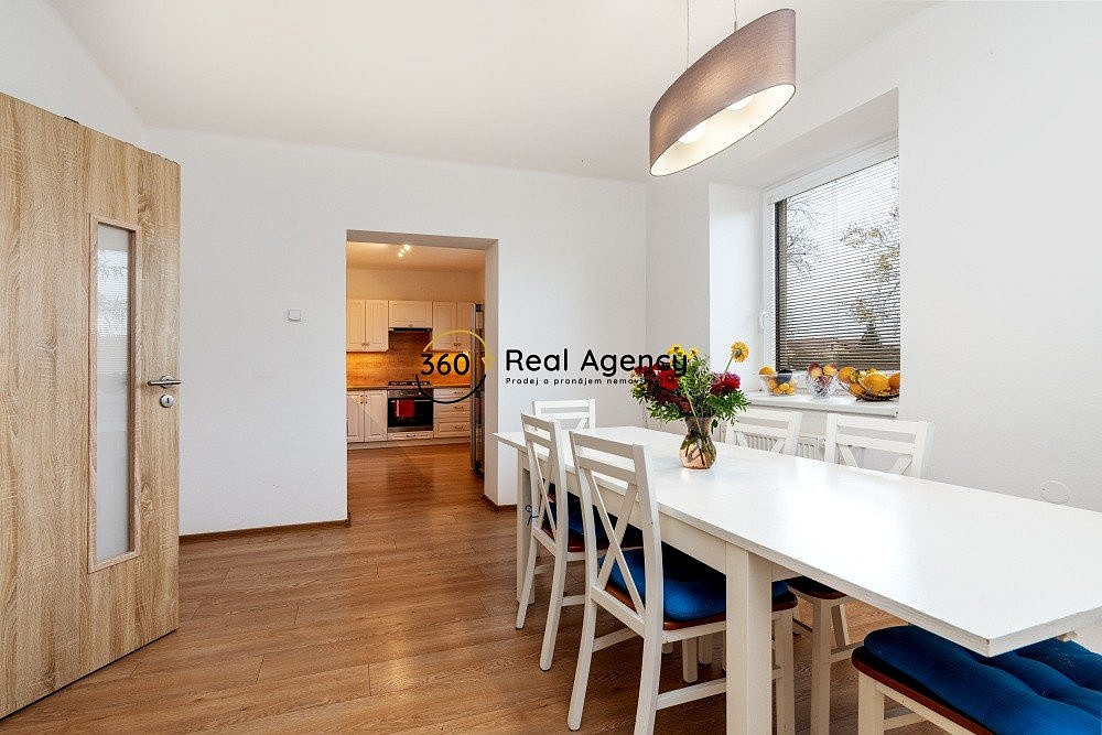 Světlá kuchyně s jídelnou jako srdce domova, oddělený obývací pokoj, tři pokoje pro rodinu či práci, koupelna a samostatná toaleta.