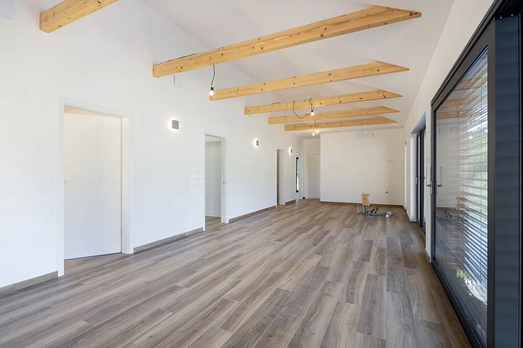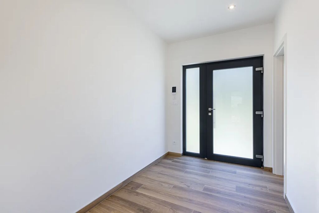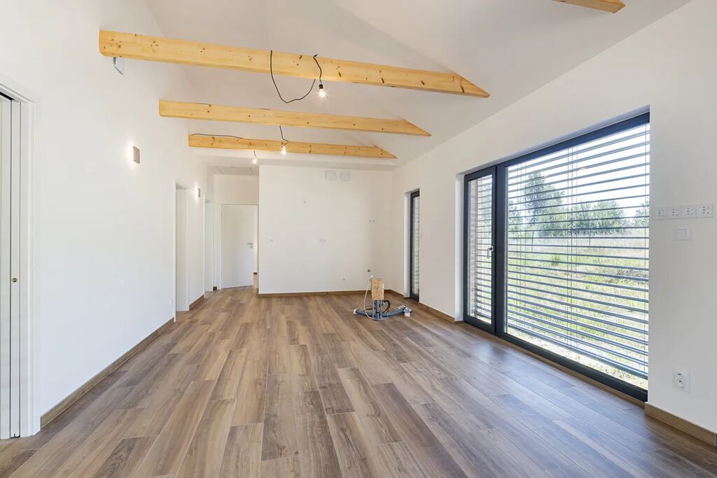 Interiér je promyšlený do posledního detailu – italská dlažba, luxusní koupelnové obklady, špičková sanita i stylové interiérové dveře Prüm. Velkoformátová posuvná okna HS Portál propojují vnitřní prostor s venkovní přírodou a dodávají domu vzdušnost a eleganci.
