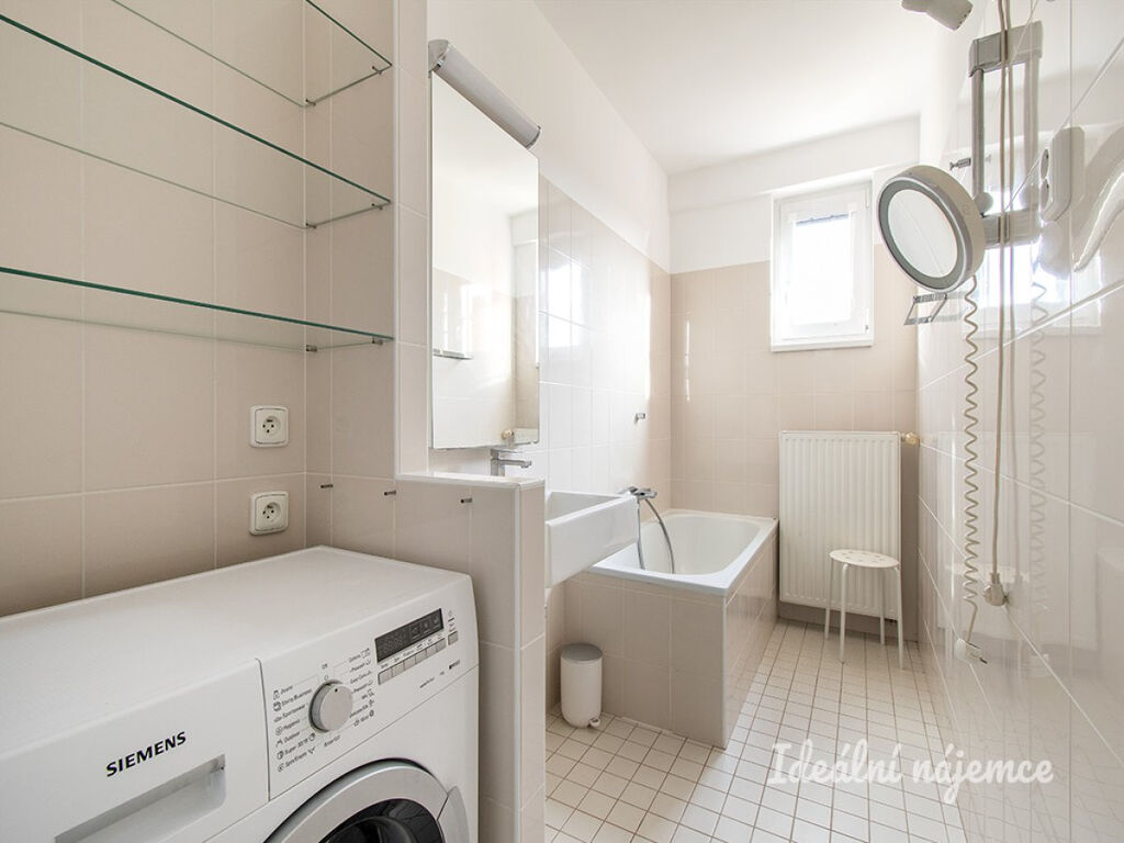 Z prostorné vstupní haly se dostáváme nejdříve do ložnice, která disponuje dostatkem uložních prostor díky vestavěné šatní skříni. Dále plně vybavenou kuchyní skrz jídelní část až do obývacího pokoje, ve kterém můžeme ponechat sedačku, taburetku a konferenční stolek. Koupelna se nabízí s pračkou, toaleta je odděleně. Součástí pronájmu je i sklepní kóje.