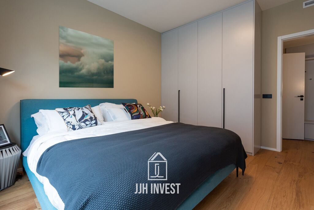 Interiér je kompletně zařízen profesionálním designérem ve vysokém standardu – kuchyňská linka na míru se značkovými spotřebiči, vestavný nábytek, kvalitní osvětlení i kompletní vybavení ložnic a obývací části.