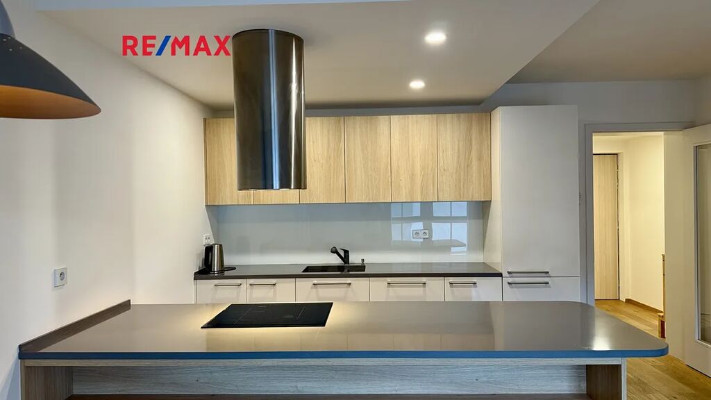 Byt tvoří prostorný obývací pokoj s moderní kuchyní a kuchyňským ostrůvkem, vybavenou vestavěnými spotřebiči včetně lednice.