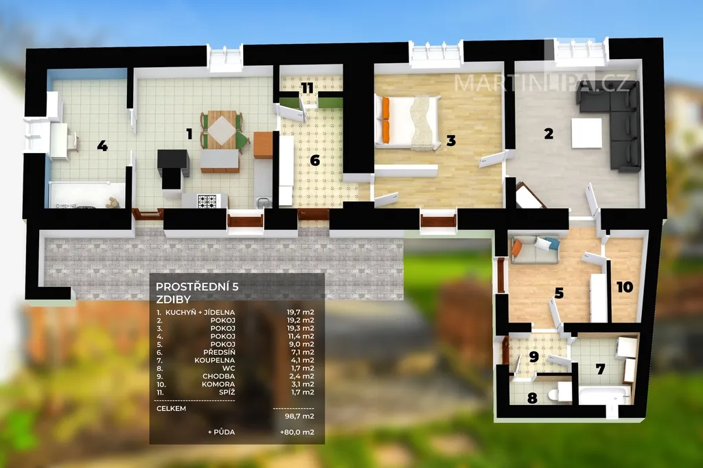 Podlahová plocha bez půdy činí 98m2, půda k tomu přidává dalších 80m2.