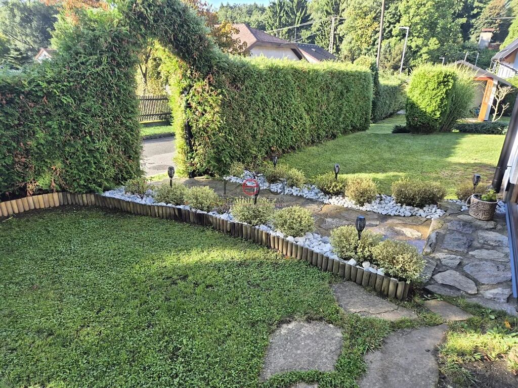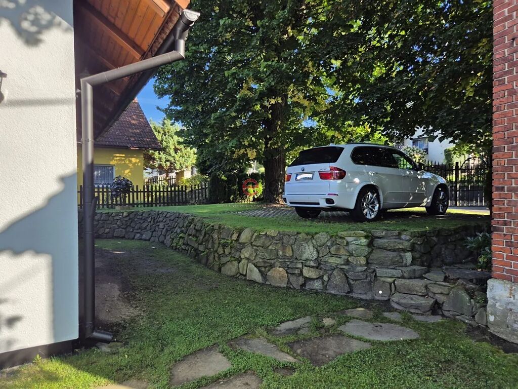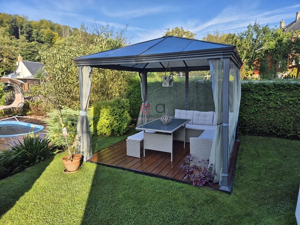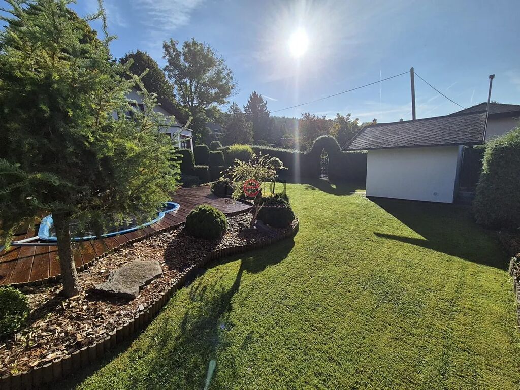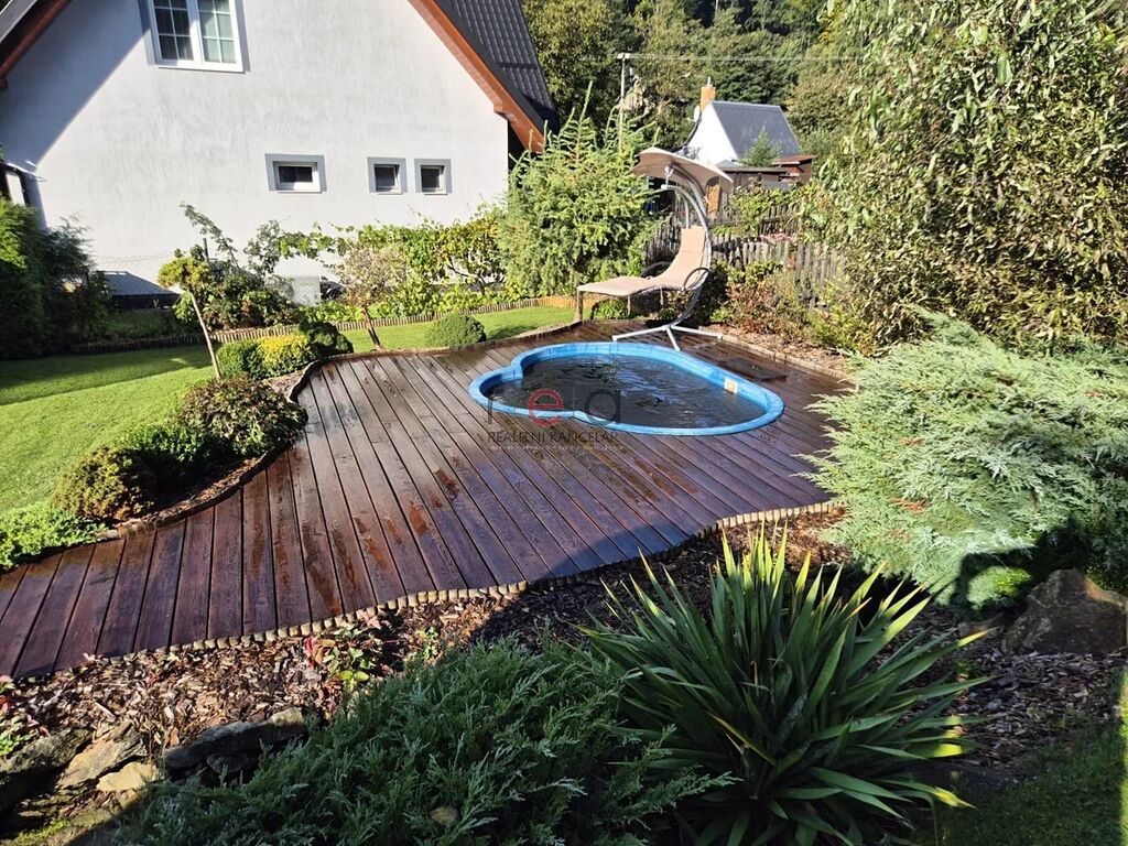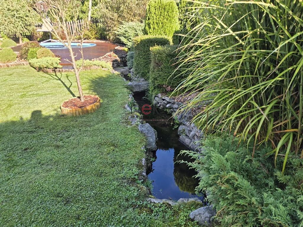 K domu náleží velmi vkusně upravená zahrada se vzrostlými porosty, které poskytují dostatečné soukromí, zapuštěný bazén s terasou, altán pro relaxaci, regulovaný potůček protékající zahradou, stání pro dvě auta, domek na zahradní techniku.