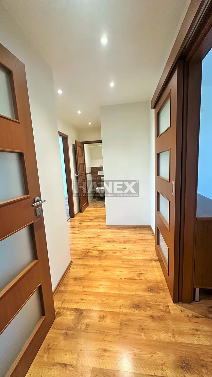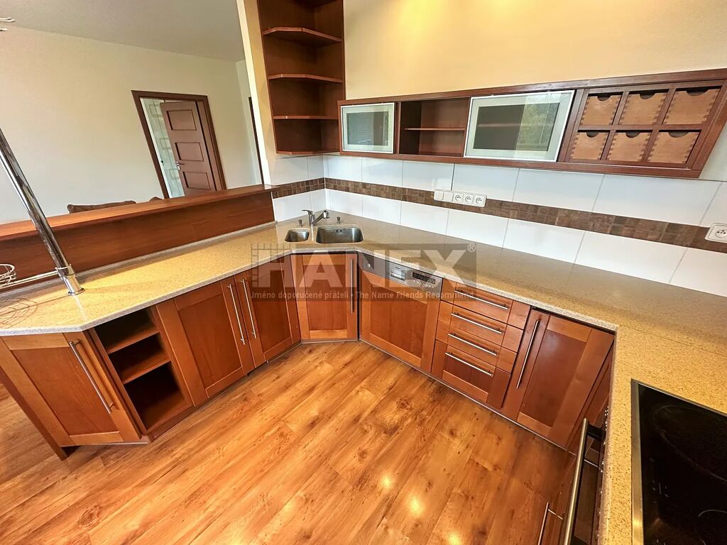 Svou dispozicí se skládá z prostorné vybavené kuchyně, obývacího pokoje, který je oddělen opticky barovým pultem. Sousední je hlavní ložnice se vstupem na balkon. Z prostorné chodby, kde je místo pro vestavěné šatní skříně se vchází do dvou menších pokojů či ložnic. Dále je zde samostatná toaleta a koupelna s vanou, toaletou a pračkou. Veškeré vybavení dle fotografiích zůstává. Sklep k bytu není.