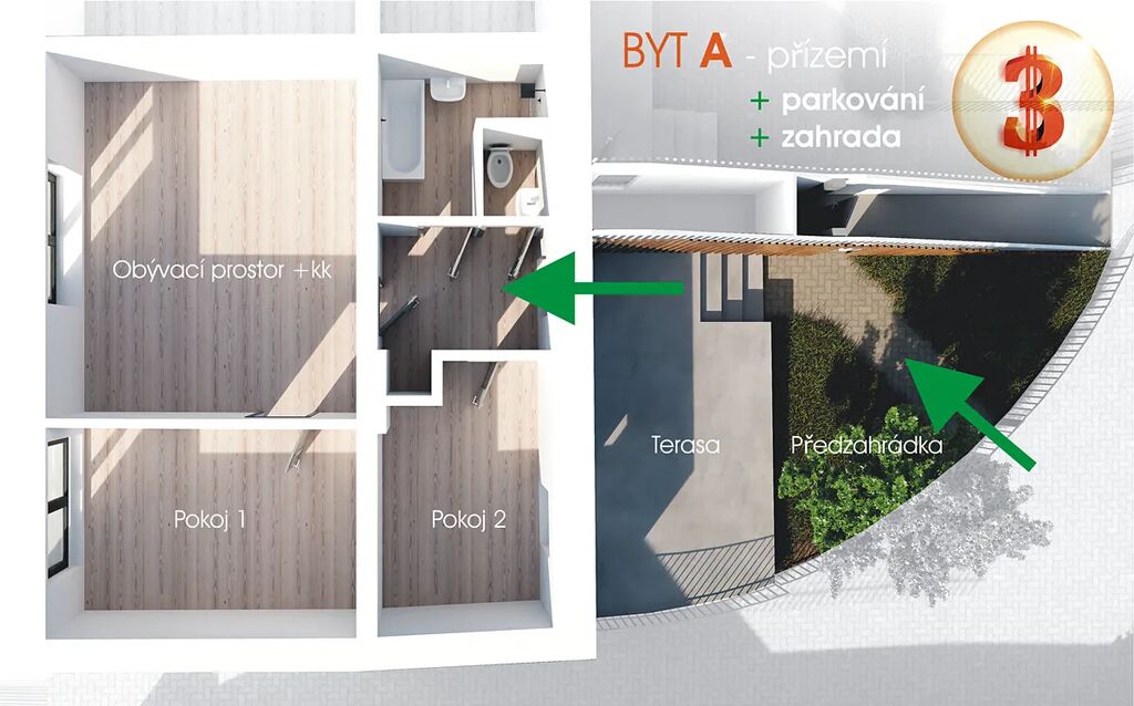 S užitnou plochou 65 m² dále doplněnou krásnou a prostornou předzahrádkou do unikátního dvora, dále francouzskými okny z druhé strany bytu a dokonce i vlastní plnohodnotnou zahradou přímo za dvorem či parkováním v tomto bezpečně uzavřeném dvoře poskytuje tento byt jistě dostatek celkového prostoru a zázemí pro zcela komfortní životní styl. K bytu pak náleží samozřejmě také ještě další doplňující úložný prostor. Je zkrátka navržen tak, aby splňoval všechny současné standardy nejen moderního ale také opravdu spokojeného bydlení.