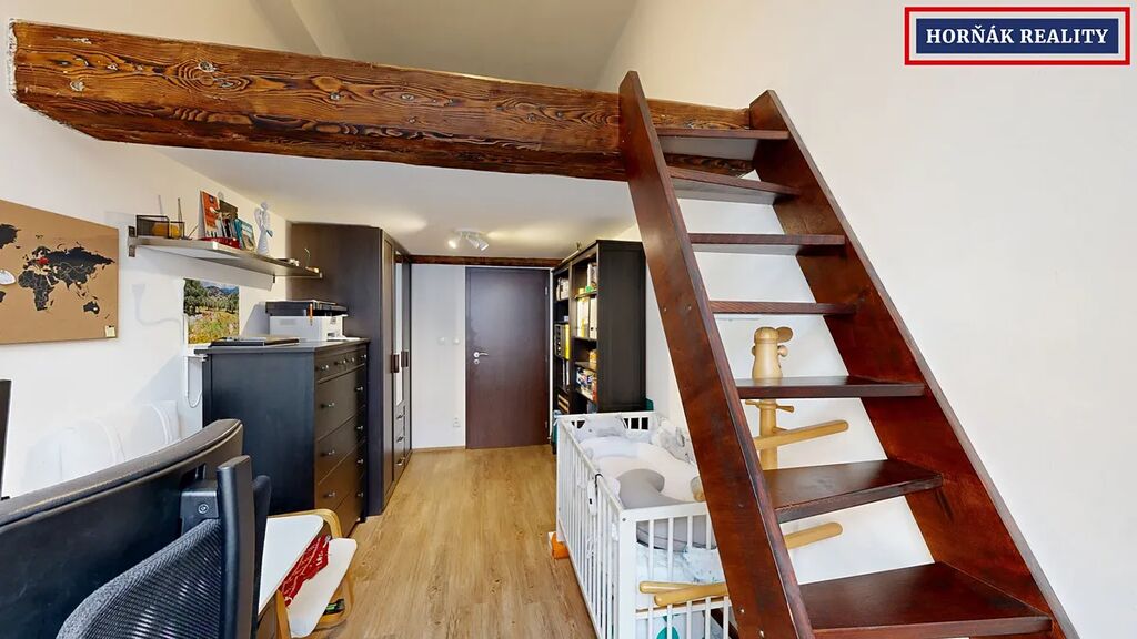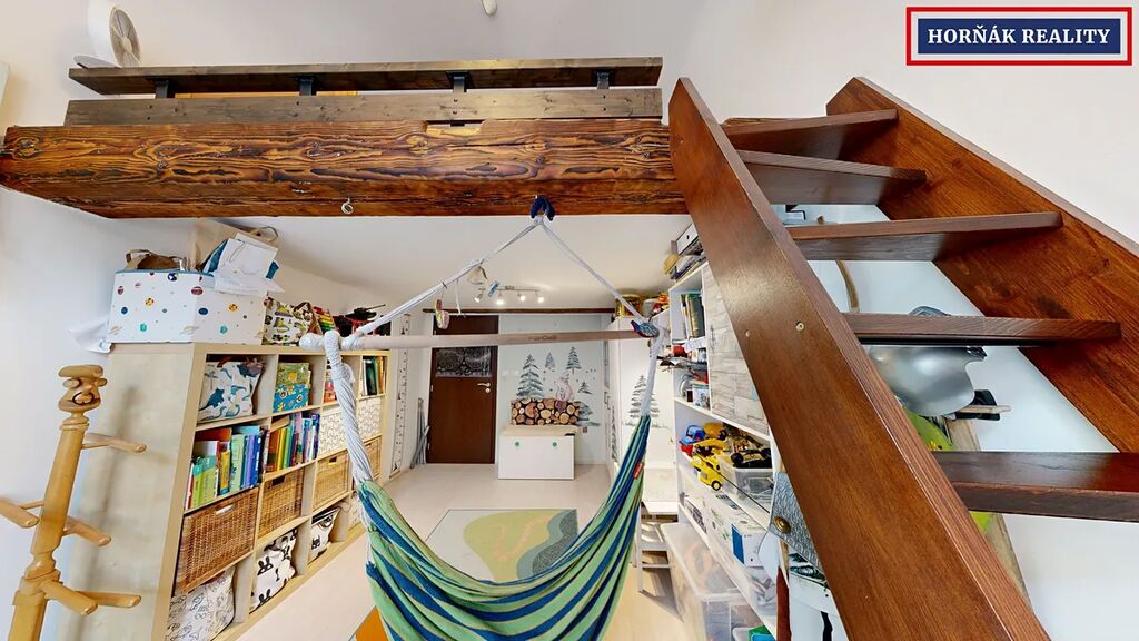 Byt zaujme nejen svými vysokými stropy (4,5 m), díky nimž působí velmi vzdušně a prostorně. V obou dětských pokojích je pak velmi prakticky vytvořeno spací patro. Kuchyňský kout zcela volně a přirozeně navazuje na prostornou obývací část, odkud je přístup také do prostorné koupelny a oddělené toalety.