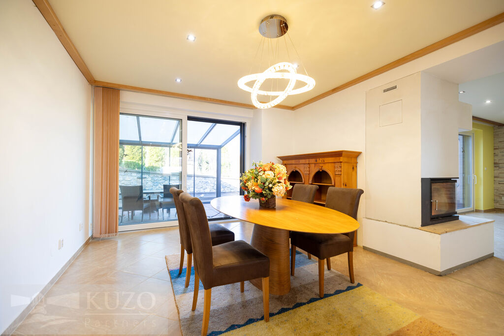 V přízemí (126,17m2) se nachází vstupní chodba s šatní skříní a botníkem, prostorný obývací pokoj s krbem, jídelna s kuchyňským koutem s vestavěnými el.spotřebiči, samostatné WC, prostorná šatna s úložným prostorem pod schodištěm, ložnice s šatnou, koupelna se sprchovým koutem, WC, 2xumyvadlo, sauna, technická místnost.
