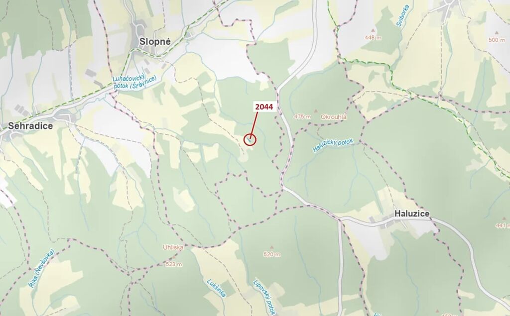 Lesní pozemek o výměře 471 m2, parcelní číslo 2044, podíl 1/1, katastrální území Slopné, obec Slopné, obec s rozšířenou působností Luhačovice, okres Zlín, Zlínský kraj. Po těžbě.
