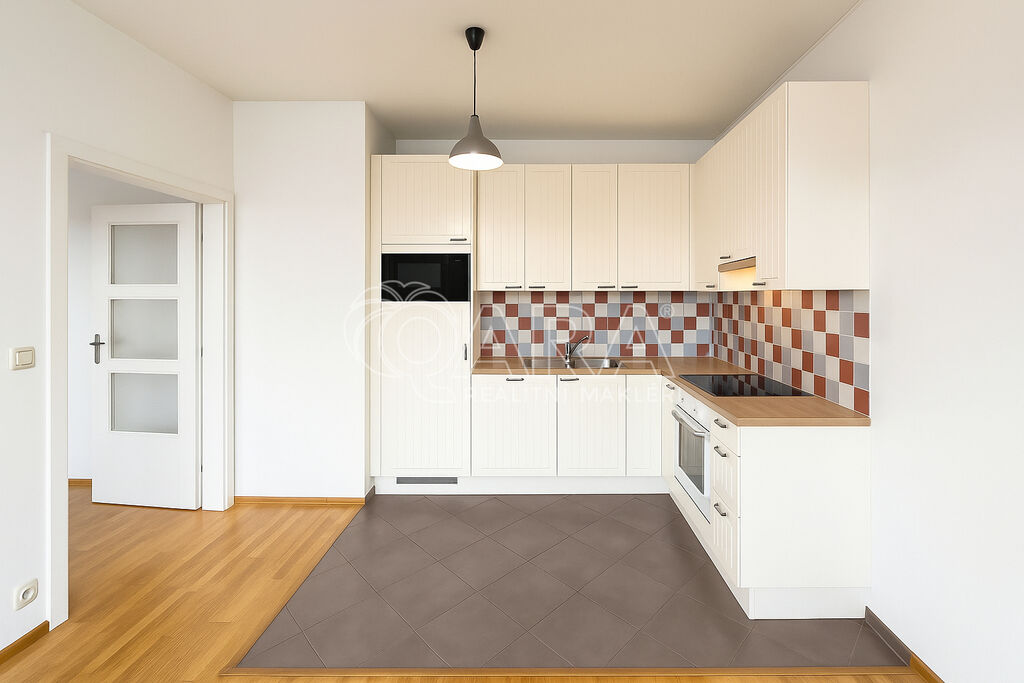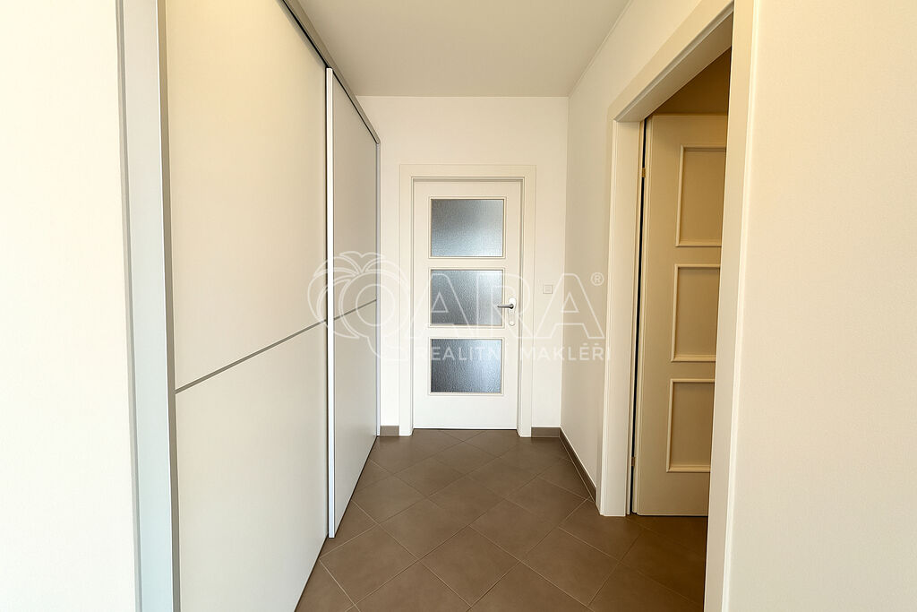 Jednotka se nachází v 6. NP a na patře jsou pouze jedni sousedé. Vstupní chodba s úložnými prostory v podobě posuvné skříně. Obývací pokoj s plně vybaveným kuchyňským koutem a vstupem na terasu. Sedačka, venkovní posezení, jídelní stůl se židlemi součástí vybavení.