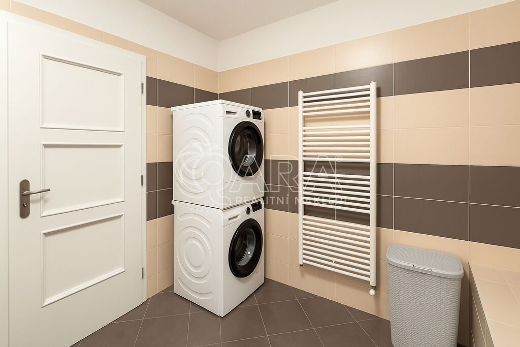 Ložnice s manželskou postelí, prostorná skříň a dvě komody. Koupelna s vanou, umyvadlem a pračkou.