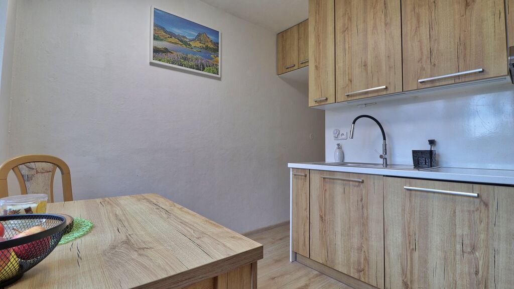 Kuchyně je vybavena kuchyňskou linkou se spotřebiči, byt lze po dohodě pronajmout s vybavením nebo bez něj. Parkování je možné v okolí domu.