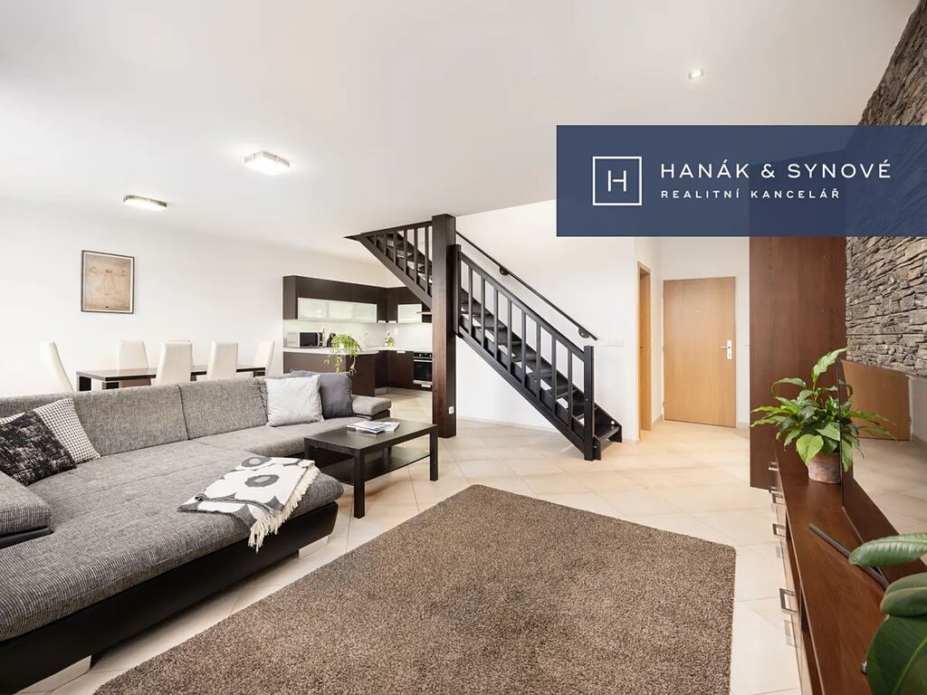 Mezonet je zařízen ve vysokém standardu a je nabízen kompletně vybavený. Byt je rozdělen na dvě patra, přičemž v 1. nadzemním podlaží se nachází vstupní chodba s vestavěnými skříněmi a prostorný obývací pokoj, ze kterého je přístup na balkon. Obývací pokoj je propojen s luxusním kuchyňským koutem vybaveným kvalitními spotřebiči (varná deska, digestoř, trouba, mikrovlnná trouba, myčka a vestavěná lednice s mrazákem). V tomto podlaží se rovněž nachází první ze dvou koupelen, která je vybavena pračkou a sušičkou.