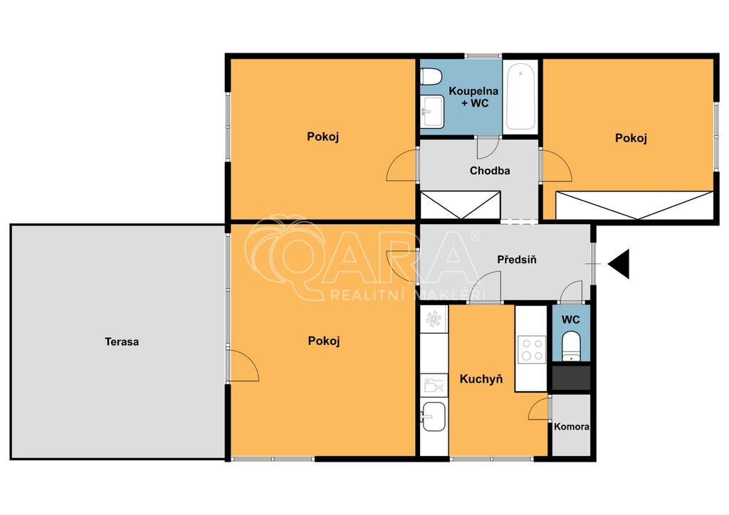 Dispozice: obývací pokoj s přístupem na terasu a zahradu, samostatná kuchyň se spíží, dvě ložnice, koupelna s vanou, toaleta zvlášť, technická místnost s pračkou v přízemí domu