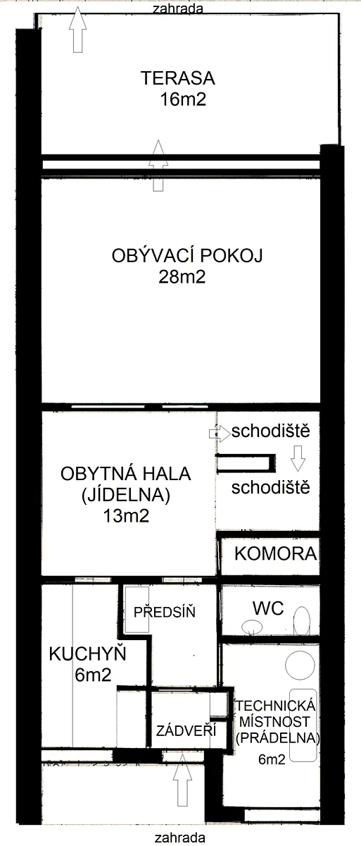 Vybavení: 2x WC, koupelna (vana), prádelna (možnost připojení pračky), kuchyň (možnost připojení myčky), šatní skříně (ložnice), stůl jídelní rozkládací, židle jídelní (6x), dřevěná komoda a skleník, šatní stěna (předsíň).