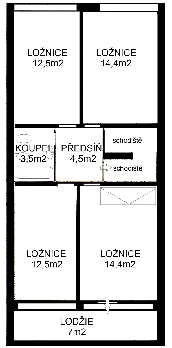 V patře jsou čtyři samostatné ložnice 14,5m² (2x) a 12,5m² (2x), balkon (přístupný z jedné ložnice) a koupelna s vanou (WC, bidet).
