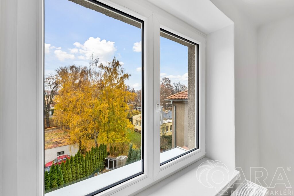 Přestože má kuchyně okno směrované do rušné křižovatky, díky novým plastovým oknům máte v bytě zajištěné ticho a klid. Okna z obou klidových pokojů jsou otočena do zelené zóny směrem k potoku.