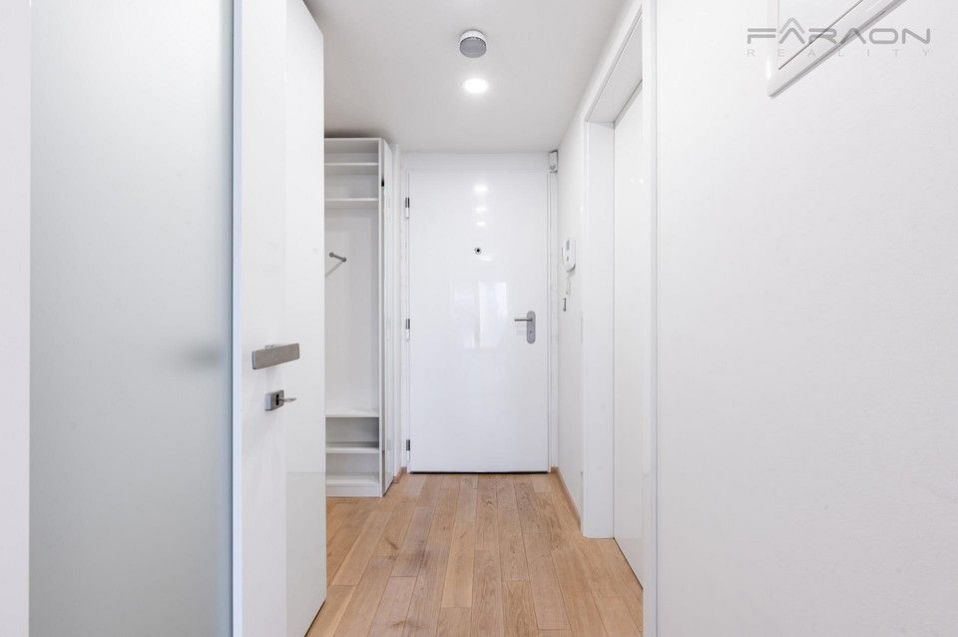 Pronájem moderního, kompletně vybaveného bytu 1+kk (35m2) s klimatizací, parkovacím místem a velkým sklepem (v ceně nájmu) v 15.podlaží domu v novostavbě bytového projektu Garden Tower s recepcí, ostrahou, v atraktivní části Prahy - na rozhraní Vinohrad a Žižkova se snadnou dostupností do centra Prahy. 8 minut tramvají od Václavského náměstí. Zastávka tramvají je přímo před domem. V minutové docházkové vzdálenosti stanice metra A Želivského, Flora.