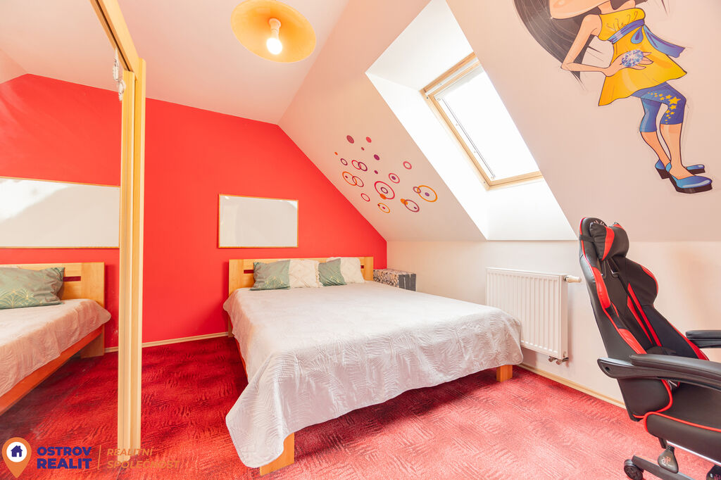 Součástí patra je také komfortní koupelna s WC, vybavená vanou i dostatkem prostoru pro úložné řešení. Celé patro působí světlým a klidným dojmem – ideální zóna pro odpočinek a rodinné zázemí.