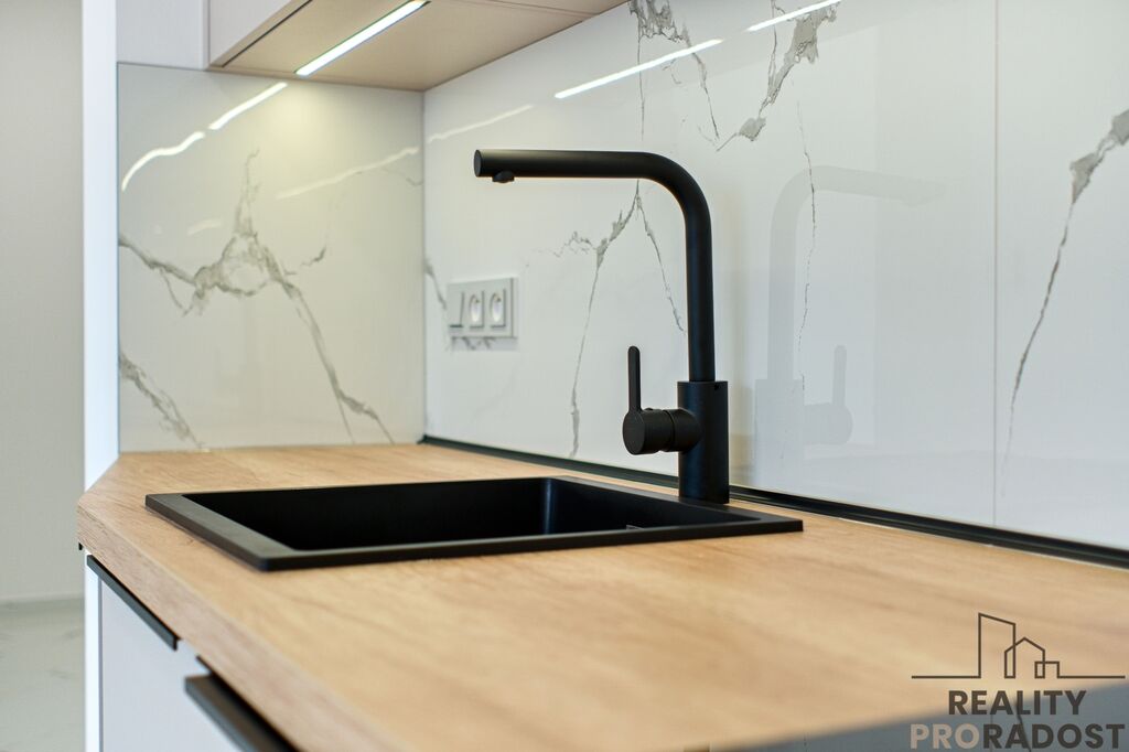 Kuchyňská linka vyrobená na míru kombinuje dekory kašmírově šedé a dubu Nebrasky. Vestavěné spotřebiče v kontrastní černé barvě (lednice s mrazákem, trouba, indukční deska, odsavač par s uhlíkovým filtrem) jsou značky Whirpool v kontrastní černé barvě, granitový dřez Franke. Kombinuje se zde systém otevírání pomocí úchytek a tip on systému, kovaní je použito od značky Blum. Pod horními skříňkami je LED osvětlení. Za pracovní deskou je použit velkoformátový obklad v dekoru mramoru.