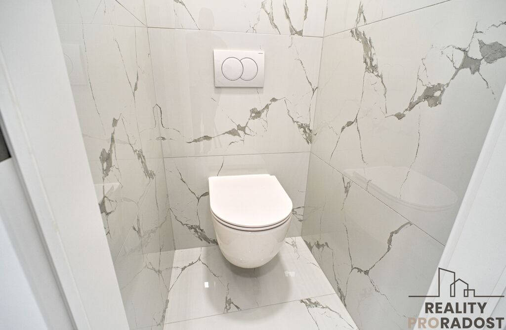 Na chodbě, v kuchyni, v koupelně a na toaletě je aplikována dlažba v dekoru bílého a antracitového mramoru v rozměru 120 x 60 cm, v pokojích je položena kvalitní voděodolná vinylová podlaha.