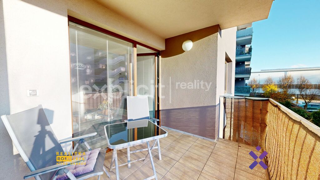 Dominantou bytu je velký balkon o výměře 7 m², ideální pro ranní kávu nebo odpočinek po práci.