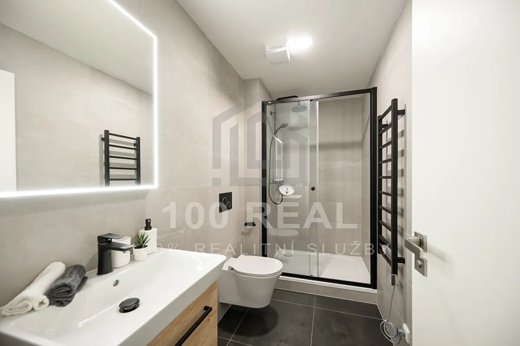 - koupelna se sprchovým koutem, umyvadlem, umyvadlovou skříňkou, topným žebříkem, světelným zrcadlem + WC