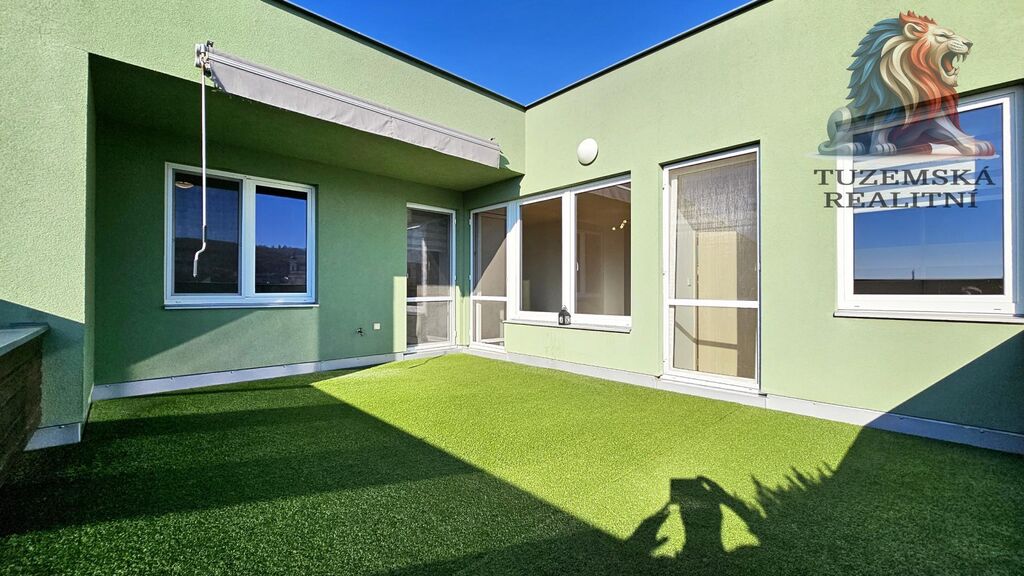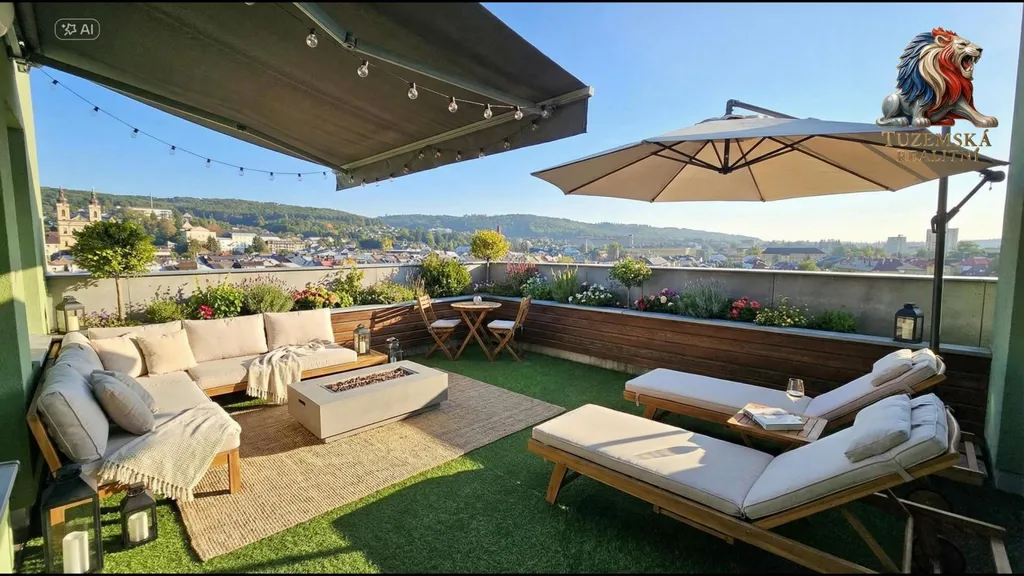 Bude-li slunce mnoho, rolovací markýza Vám poskytne příjemný stín. Majitelé bytu pod ní v létě i spali. Po obvodu terasy jsou zapuštěné květináče. Poroste Vám v nich vše, co si budete přát. Například jahody, rajčata, papriky, salát, ředkvičky, pažitka, bylinky, květiny či okrasné keře. Na zálivku je instalován kohoutek na konev či hadici, ale zaleje se i přirozeně deštěm.