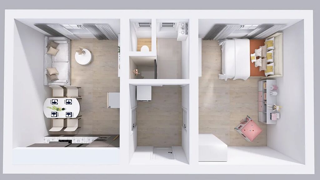 Dispozice: vstupní chodba s bojlerem, pračkou, koupelna se sprchovým koutem a WC, kuchyně spojená s jídelnou a obývacím pokojem, ložnice. Obě obytné místnosti mají necelých 17 m2.