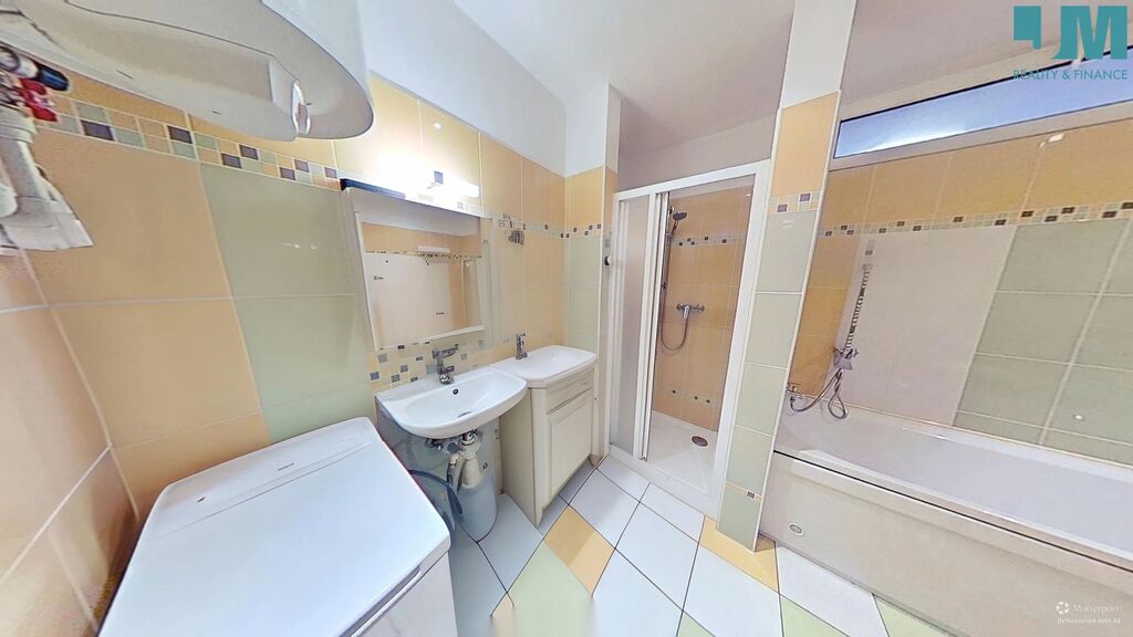 Koupelna je prostorná a po zdařilé rekonstrukci vybavená umyvadlem se zrcadlem, sprchovým koutem, vanou a vestavnou toaletou. Celkově byt nabízí moderní standard a příjemnou atmosféru pro pohodlné bydlení.