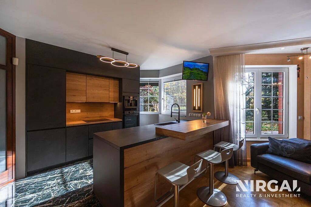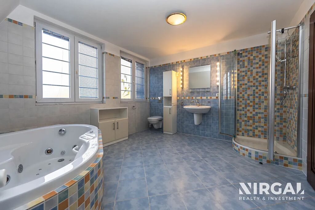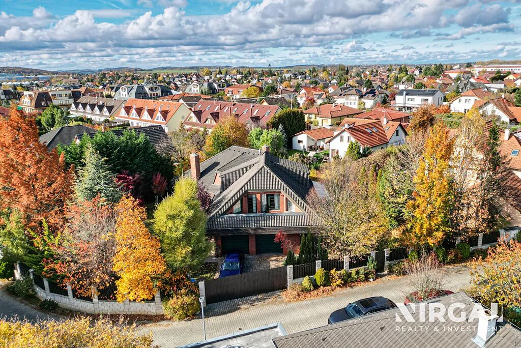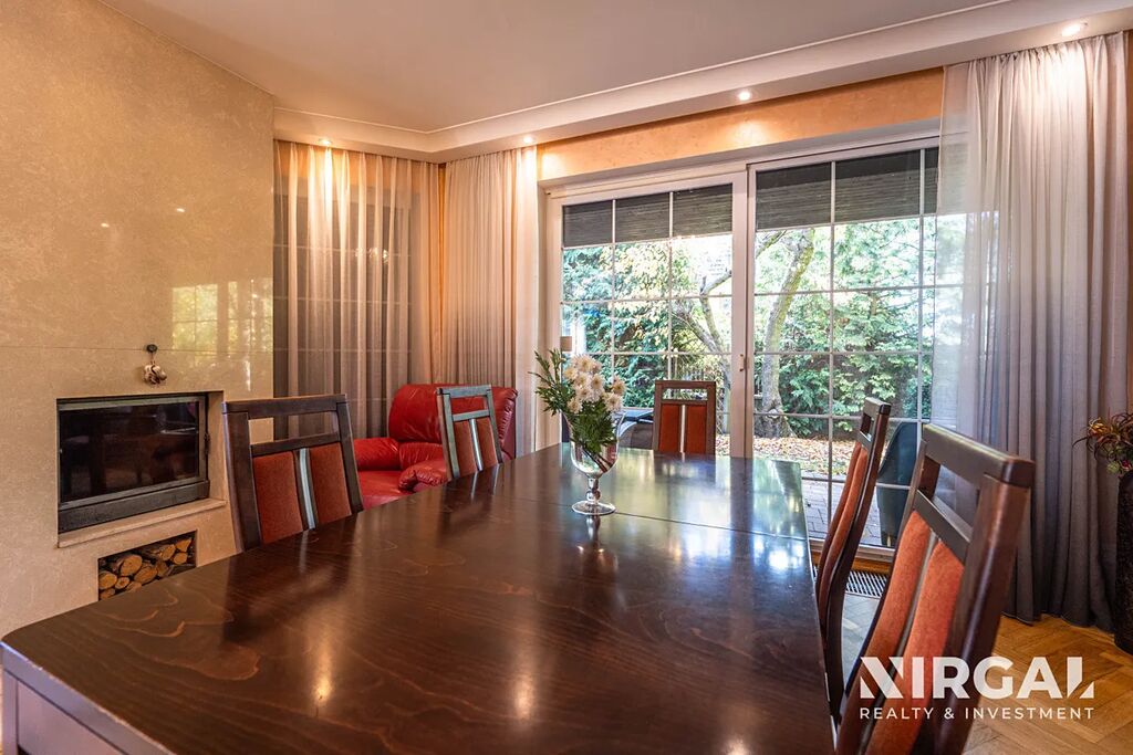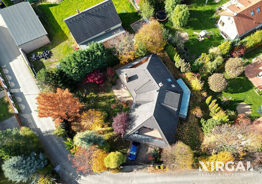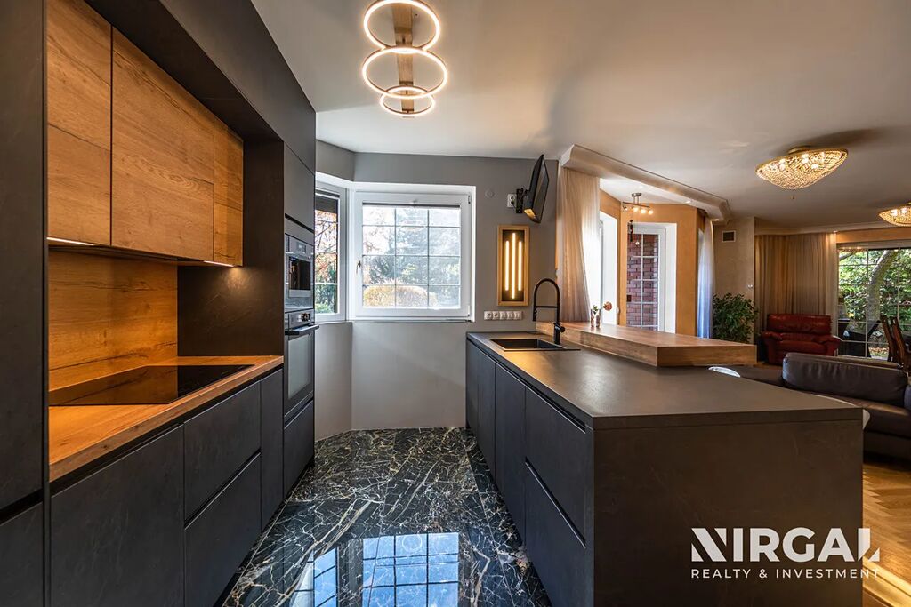 Vila s dispozicí 6+kk a užitnou plochou 383 m² stojí na rozlehlém pozemku o velikosti 1 102 m². Architektura domu působí vzdušně a harmonicky – prostorný obývací pokoj s francouzskými okny doslova propojuje interiér se zahradou a vytváří pocit plynulého přechodu mezi domem a přírodou. Dominantou je elegantní krb, který přináší teplo i atmosféru.