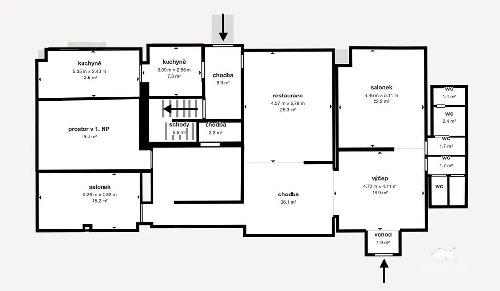 V přízemí je restaurace, výčep, hlavní sál, dva salónky, WC, nově přistavěná kuchyně a částečně i prostor pro výrobu a prezentaci piva.