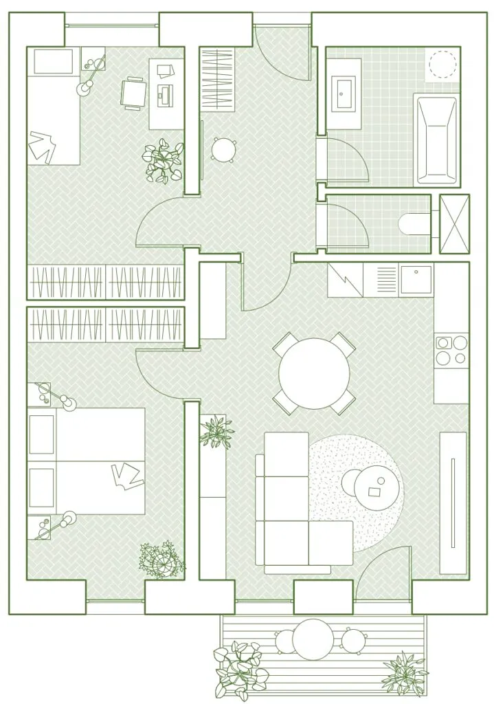 zděná/železobetonová konstrukce, okna s trojskly a příprava pro venkovní stínění, ústřední vytápění z domovní kotelny, v bytě podlahové topení a žebřík v koupelně. Dispozice nabízí obývací prostor s přípravou na kuchyňskou linku, dvě ložnice, koupelnu a samostatné WC; standard zahrnuje plovoucí podlahy v obytných místnostech, keramickou dlažbu a obklady v koupelně a na WC, interiérové dveře s obložkami, bezpečnostní vstupní dveře, datové rozvody a videotelefon.