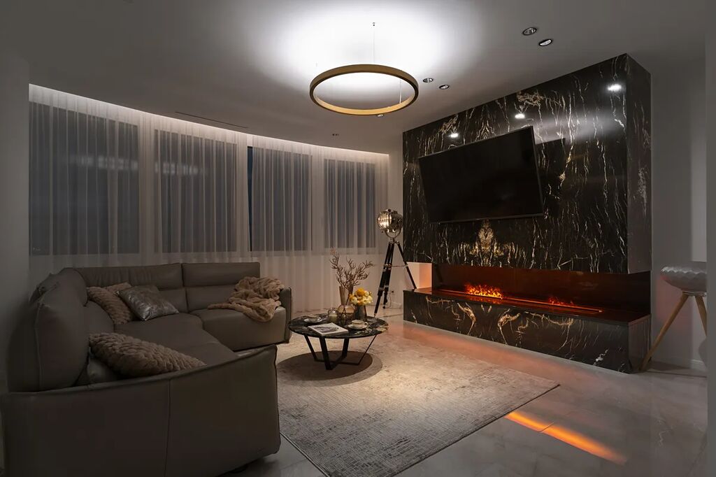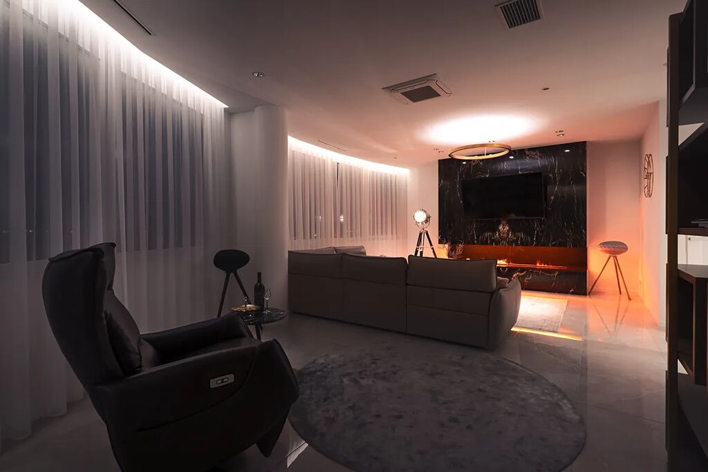 Příjemné chvíle s rodinou nebo přáteli si budete užívat v prostorném, luxusně vybaveném obývacím pokoji o velikosti 45 m², který je orientován na jih. Moderní žulový krb a kožená sedací souprava od ikonické italské značky Natuzzi. Dokonalou atmosféru doplňuje klimatizace, rekuperace a podlahové vytápění v celém bytě.