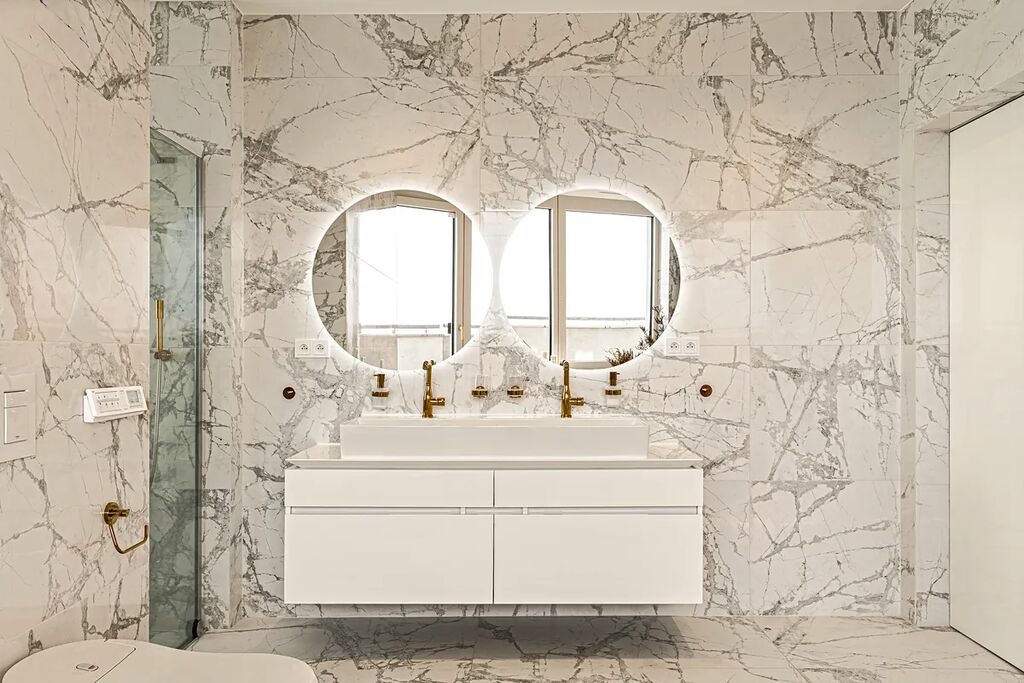 Obě koupelny jsou vybaveny těmi nejluxusnějšími zařizovacími předměty: velkorysými sprchovými kouty, chytrými toaletami Grohe a velkoformátovými obklady – vše tvoří jedinečnou atmosféru.