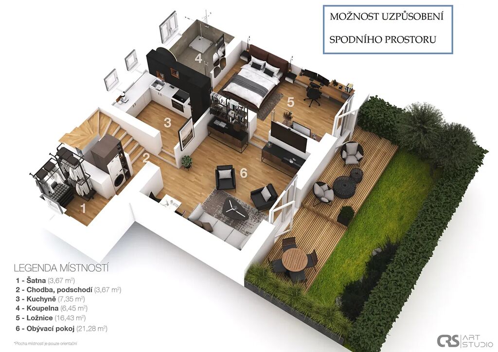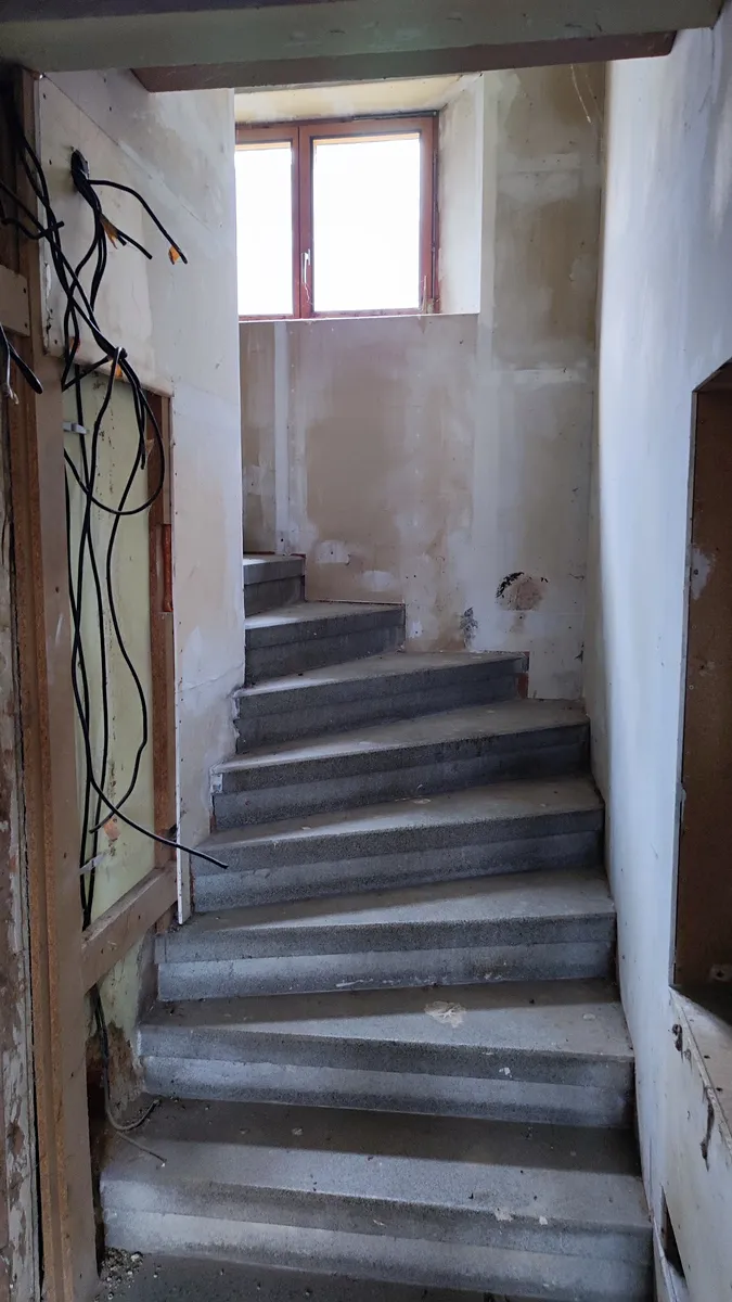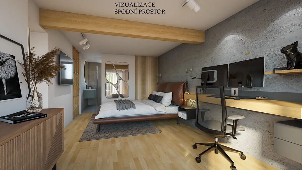 Spodní podlaží je přípravo na druhou jednotku, prostor je vhodný na obytný ateliér o velikosti 68m2. V současné době jsou hotové rozvody vody, elektroinstalace, vedení topení včetně topných těles, nový boiler, v místnostech instalovány sádrokartonové stěny, plastová okna. Budoucí samostatná jednotka je připravena na dodělání podlah, povrchovou úpravu stěn a stropů, instalaci a osazení sanity a další interiérové úpravy, podle vlastních představ nového vlastníka.
