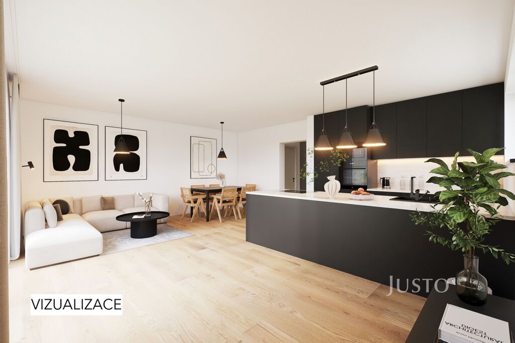 Dispozice domu je promyšlená do posledního detailu. Dominantou přízemí je otevřený obývací prostor s kuchyňským koutem o výměře 34,84 m² – místo, kde se odehrává každodenní rodinný život. Díky přímému vstupu na terasu (13,8 m²) a zahradu se interiér krásně propojuje s venkovním prostorem. Nechybí ani pracovna či pokoj pro hosty (9,69 m²), který se přizpůsobí vašim aktuálním potřebám – ať už jde o práci z domova, nebo ubytování návštěvy. Dále v přízemí najdete zádveří (5,43 m²), chodbu (5,14 m²), technickou místnost (2,10 m²) a koupelnu s walk-in sprchovým koutem a WC (4,69 m²).