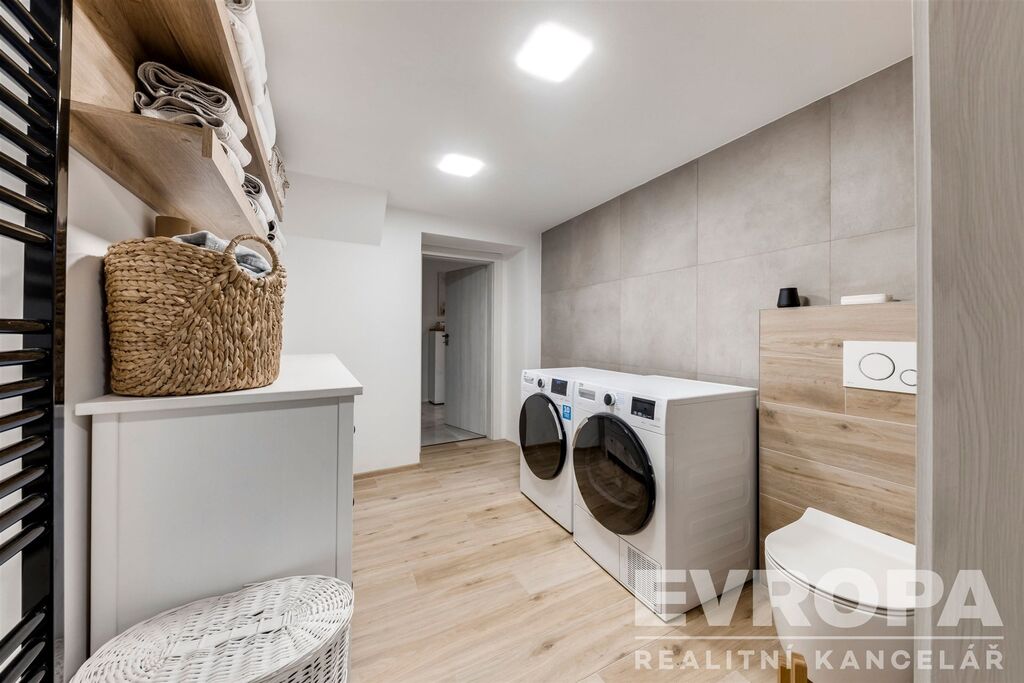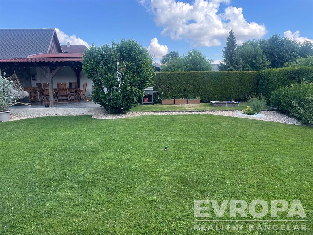 Přízemí je dělené na zádveří a předsíň, obývací pokoj s krbovou vložkou, vybavený kuchyňský kout s lux. vestavěnými spotřebiči, koupelnu se sprchovým koutem a prádelnou s toaletou a tech. místnost se šatnou. Původní garáž je využívaná jako klidová zóna ve které se nachází infrasauna a mini fitness, vstup ze zahrady. Na zahradě krásná krytá pergola, zahradní domek ........