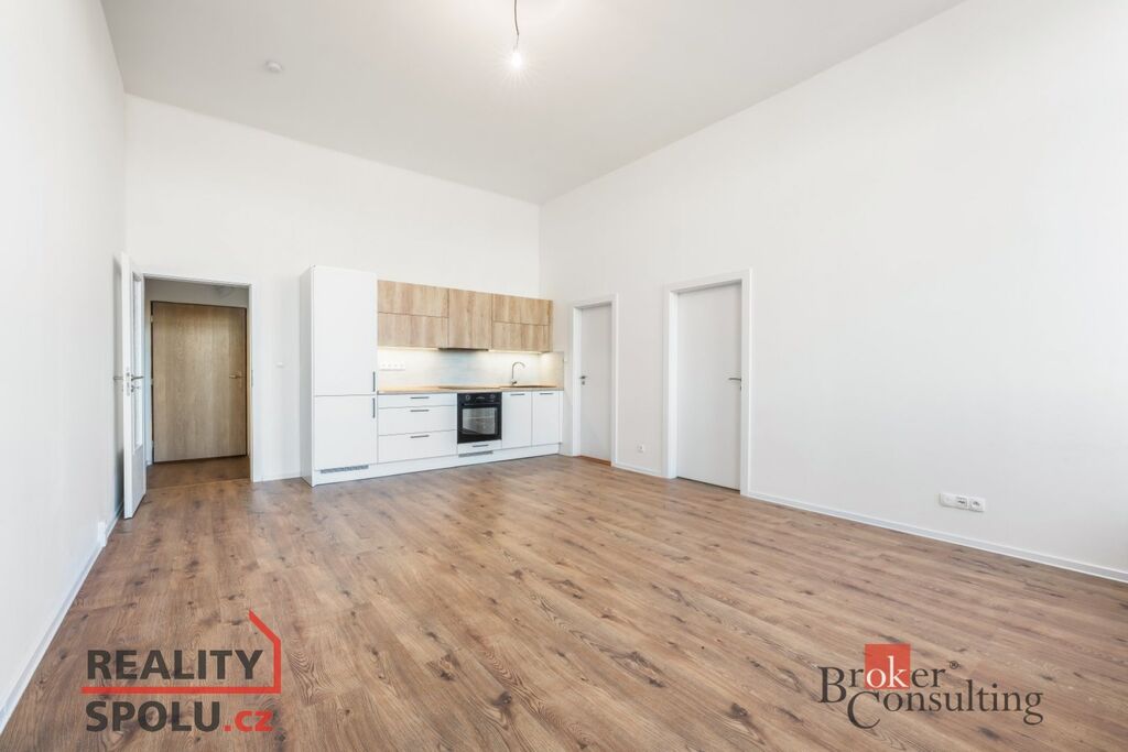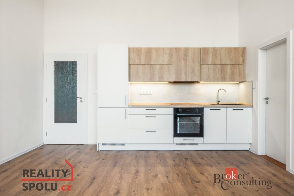 Součástí je plně vybavená kuchyňská linka se spotřebiči – elektrická trouba, indukční varná deska a lednice s mrazákem. Praktická dispozice bytu nabízí dostatek prostoru pro pohodlné bydlení.