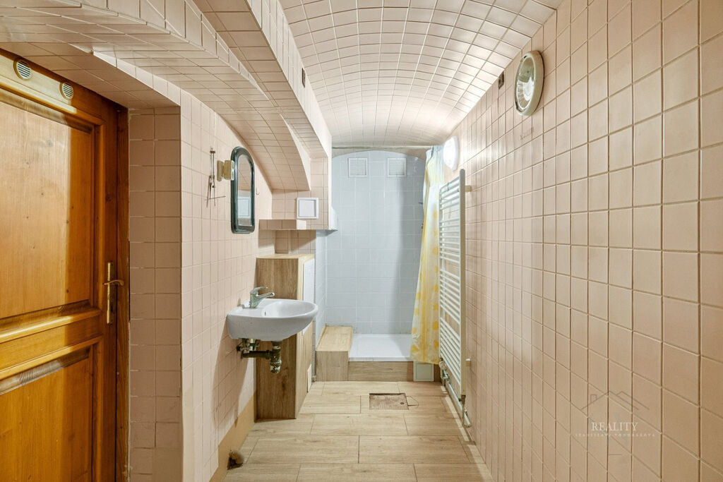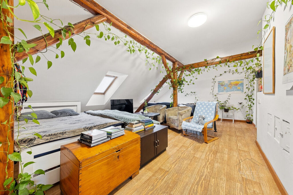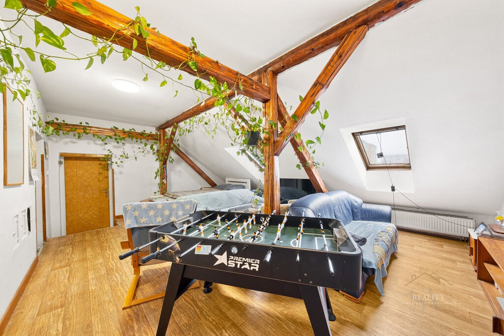 Podkroví (cca 90 m²) nabízí koupelnu s vanou, WC a umyvadlem, plynový kotel s bojlerem 40 l a dřevěná střešní okna Velux.