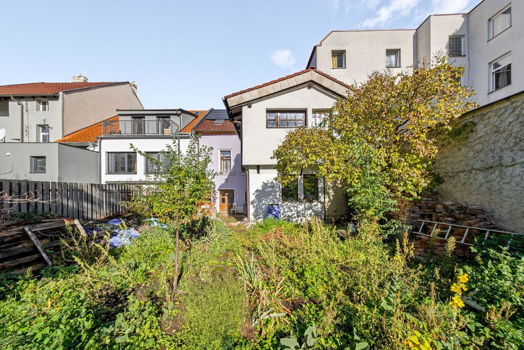 Za domem se nachází soukromá zahrada ve vnitrobloku s přístavkem využívaným jako ateliér.