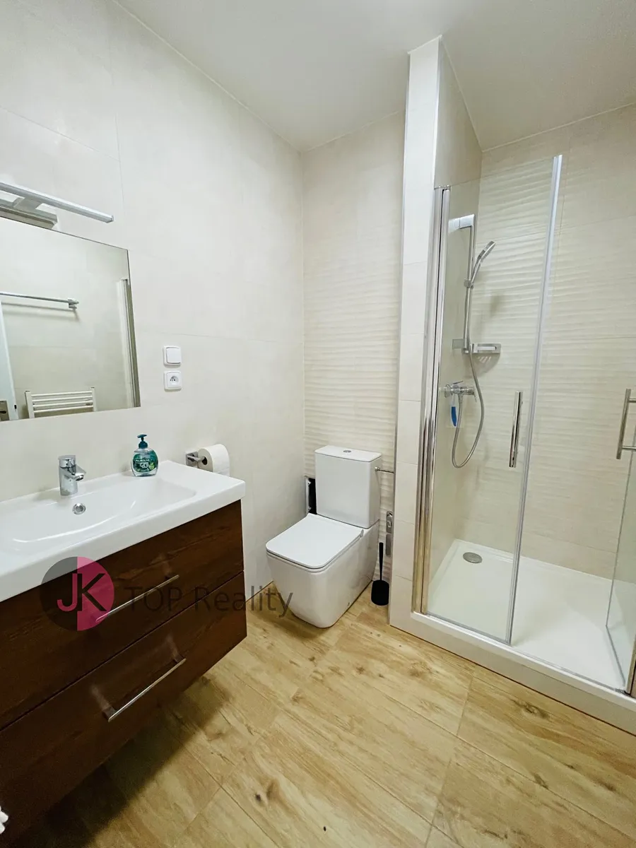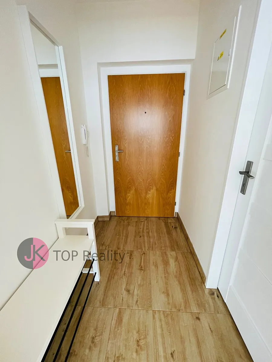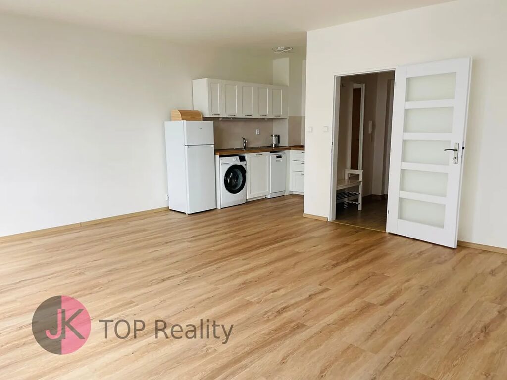 Byt je po kompletní rekonstrukci – nová kuchyňská linka je vybavena elektrickým dvouvařičem, troubou, mikrovlnnou troubou, myčkou nádobí, lednicí s mrazákem, pračkou a rychlovarnou konvicí.